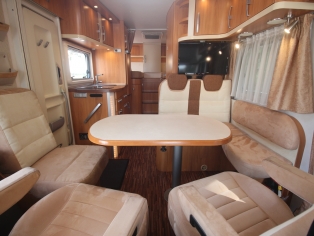 De comfort ingangsdeur is voorzien van een schuifbare hordeur en een elektrisch en geïntegreerde opstap. De royale keuken bevat een spoelbak en 3 pits kooktoestel met ontstekingsautomaat, diverse gelagerde laden met verrassend veel bergruimte voor het kookgerei en boodschappen, en grote Thetford koelkast met vriesvak.