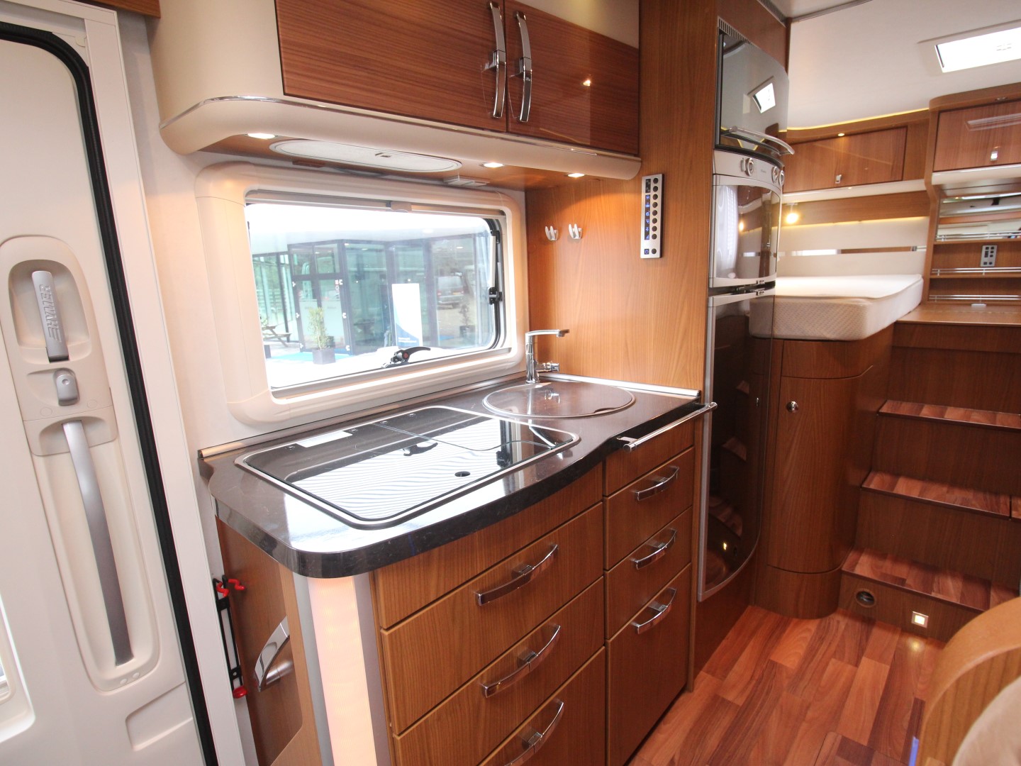 De comfort ingangsdeur is voorzien van een raam, schuifbare hordeur, en een elektrisch en geïntegreerde opstap. De royale keuken bevat een spoelbak en 3 pits kooktoestel met ontstekingsautomaat, afzuigkap, diverse gelagerde laden met verrassend veel bergruimte voor het kookgerei en boodschappen, en de Dometic Tec-Tower 160 L koelkast met aparte vriezer en griloven.