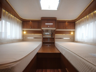 Het slaapgedeelte achterin heeft 2 enkele bedden met binnenverings matras op lattenbodem voor optimaal slaapcomfort. Bovenin de cabine bevindt zich een royaal 2 persoons hefbed. Dit betreft een SL serie en bevat een dubbele vloer met veel extra bergruimte bereikbaar dmv. diverse kleppen van buitenaf. De bijzonder royale garage is bereikbaar via een grote deur links en rechts, en biedt voldoende ruimte voor het binnenstallen van uw fietsen en andere bagage.