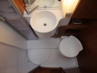 De ruime badkamer met wastafel heeft een Thetford toilet inclusief SOG, extra kastruimte en een aparte grote douchecabine.