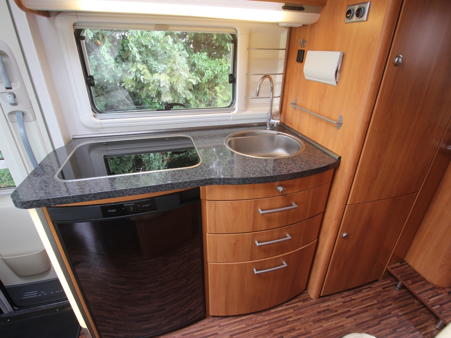 De comfort ingangsdeur is voorzien van een raam, schuifbare hordeur, en een elektrisch en geïntegreerde opstap. De royale keuken bevat een spoelbak en 3 pits kooktoestel met ontstekingsautomaat, afzuigkap, diverse gelagerde laden met verrassend veel bergruimte voor het kookgerei en boodschappen, en Dometic koelkast.