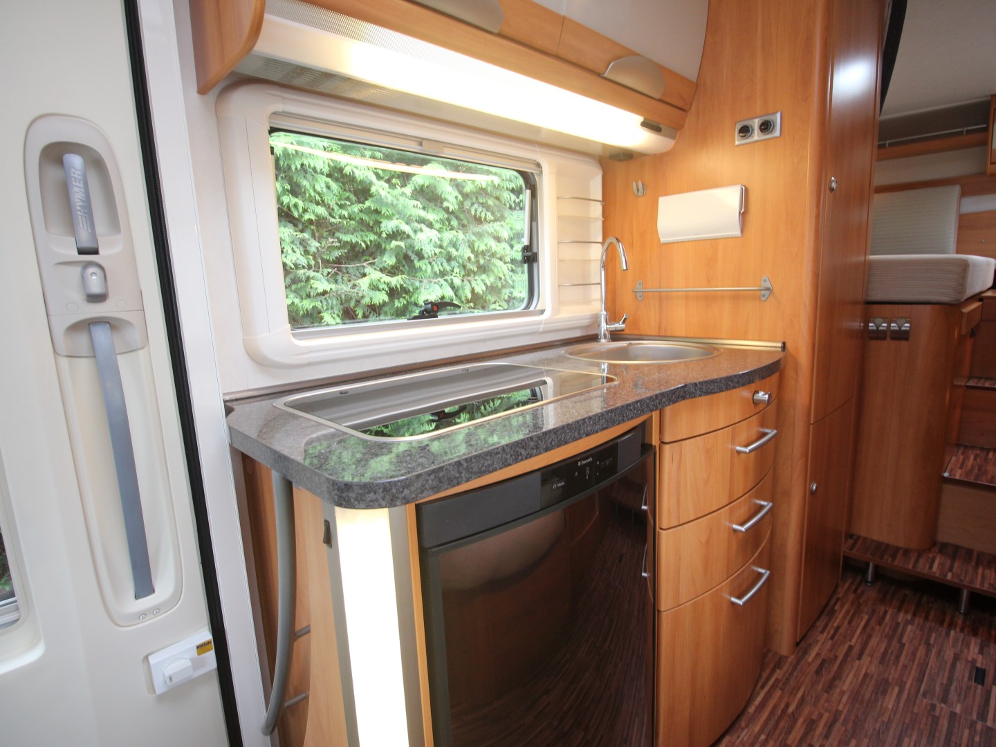 De comfort ingangsdeur is voorzien van een raam, schuifbare hordeur, en een elektrisch en geïntegreerde opstap. De royale keuken bevat een spoelbak en 3 pits kooktoestel met ontstekingsautomaat, afzuigkap, diverse gelagerde laden met verrassend veel bergruimte voor het kookgerei en boodschappen, en Dometic koelkast.