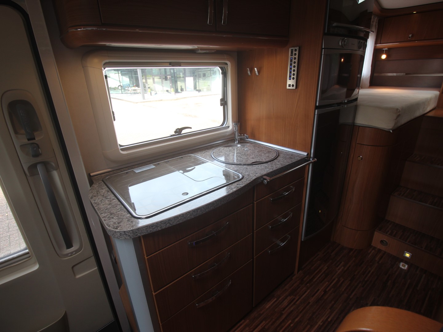 De comfort ingangsdeur is voorzien van een raam, schuifbare hordeur, en een elektrisch en geïntegreerde opstap. De royale keuken bevat een spoelbak en 3 pits kooktoestel met ontstekingsautomaat, afzuigkap, diverse gelagerde laden met verrassend veel bergruimte voor het kookgerei en boodschappen, en de Dometic Tec-Tower 160 L koelkast met aparte vriezer en griloven.