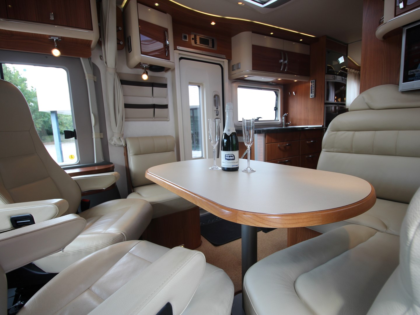 2 comfortabele pilotestoelen draaibaar naar gezellige comfort L-zit, waar u uw visite comfortabel en ruim kunt ontvangen. Schitterende bovenkastjes in cabine waar u rechtop kunt staan. Het interieur bestaat uit de unieke Hymer stijl Havanna in combinatie met zeer chique Leder Kiesel bekleding, wat met zijn vele ambiente dimbare verlichting een bijzonder mooi effect geeft. Alle ramen zijn voorzien van vouwverduistering van hoogwaardige plisséstof.