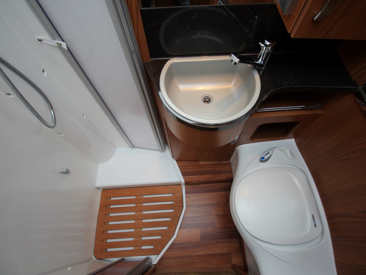 De ruime badkamer met wastafel heeft een Thetford toilet met SOG automatische toiletontluchting en een aparte grote douchecabine.