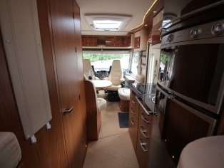 De comfort ingangsdeur is voorzien van een raam, schuifbare hordeur en een elektrisch en geïntegreerde opstap, de royale keuken bevat een spoelbak en 3 pits kooktoestel met ontstekingsautomaat, afzuigkap, diverse gelagerde laden met verrassend veel bergruimte voor het kookgerei en boodschappen, grote Dometic koelkast met aparte vriezer en luxe bakoven.