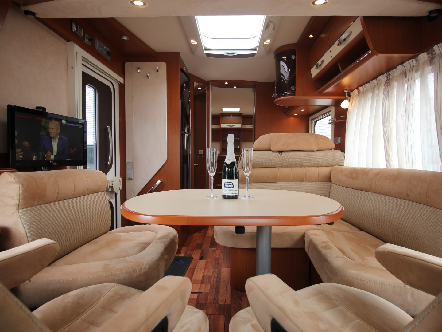 2 comfortabele Aguti Ergoflex pilotenstoelen, draaibaar naar een gezellige comfort L-zit met zijbank en luxe salontafel. Het interieur bestaat uit het stijlvolle Hymer 'Morello Select' meubilair met de luxe 'Santa Cruz' alcantara/stofbekleding wat met de vele LED verlichting een bijzondere sfeer geeft. Cabineramen zijn voorzien van vouw- verduistering van hoogwaardig plisséstof.