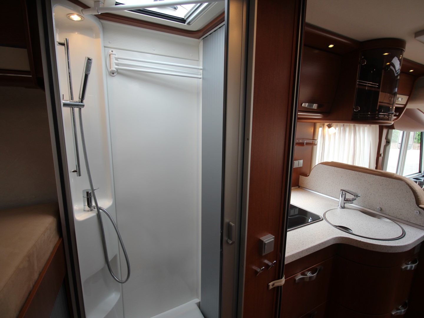 Links achterin bevind zich de ruime douchecabine, en er tegenover het toilet Thetford met SOG automatische toilet ontluchting en extra kastruimte.