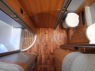 Links achterin bevind zich de ruime douchecabine, en er tegenover het toilet Thetford met SOG automatische toilet ontluchting en extra kastruimte.