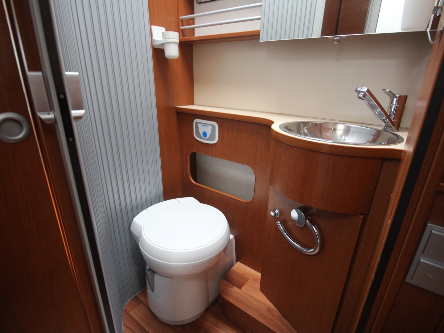 Links achterin bevind zich de ruime douchecabine, en er tegenover het toilet Thetford met SOG automatische toilet ontluchting en extra kastruimte.
