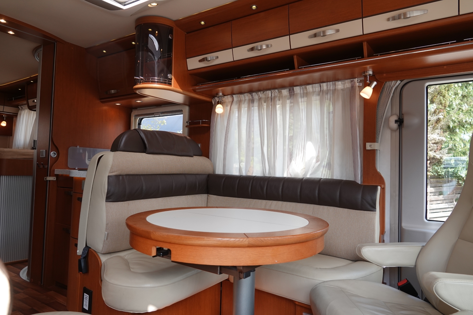 2 comfortabele met leer beklede Aguti pilotestoelen, in hoogte verstelbaar en kantelbaar, draaibaar naar een gezellig comfort L-zit met luxe uitschuifbare salontafel. Het interieur bestaat uit exclusief meubeldecor 'Palatino Apfel' in combinatie met de luxe leder/stof bekleding Trinidad, waarbij met de vele LED verlichting een bijzondere sfeer ontstaat. Schitterende bovenkastjes in cabine waar u rechtop kunt staan. De comfort ingangs-deur is voorzien van een raam, schuifbare hor, en elektrische opstap. Alle ramen zijn voorzien van vouwverduistering van hoogwaardige plisséstof.