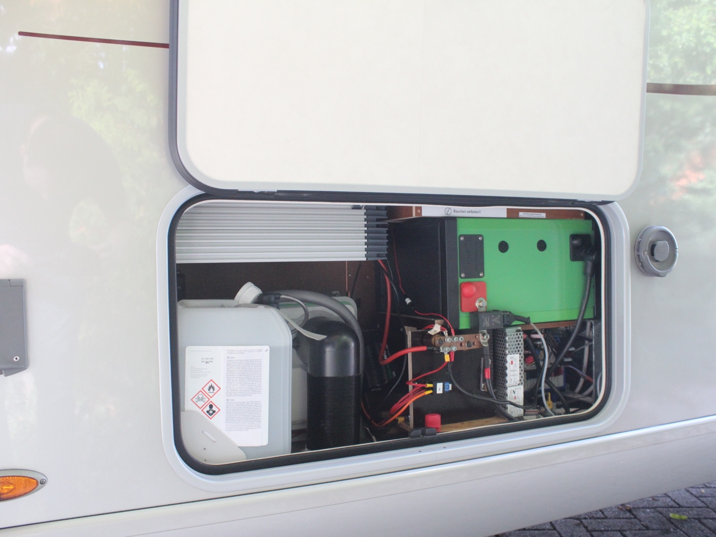 De 120 ltr schoon - en 100 ltr vuilwatertank bevinden zich in de (verwarmde) dubbele vloer.