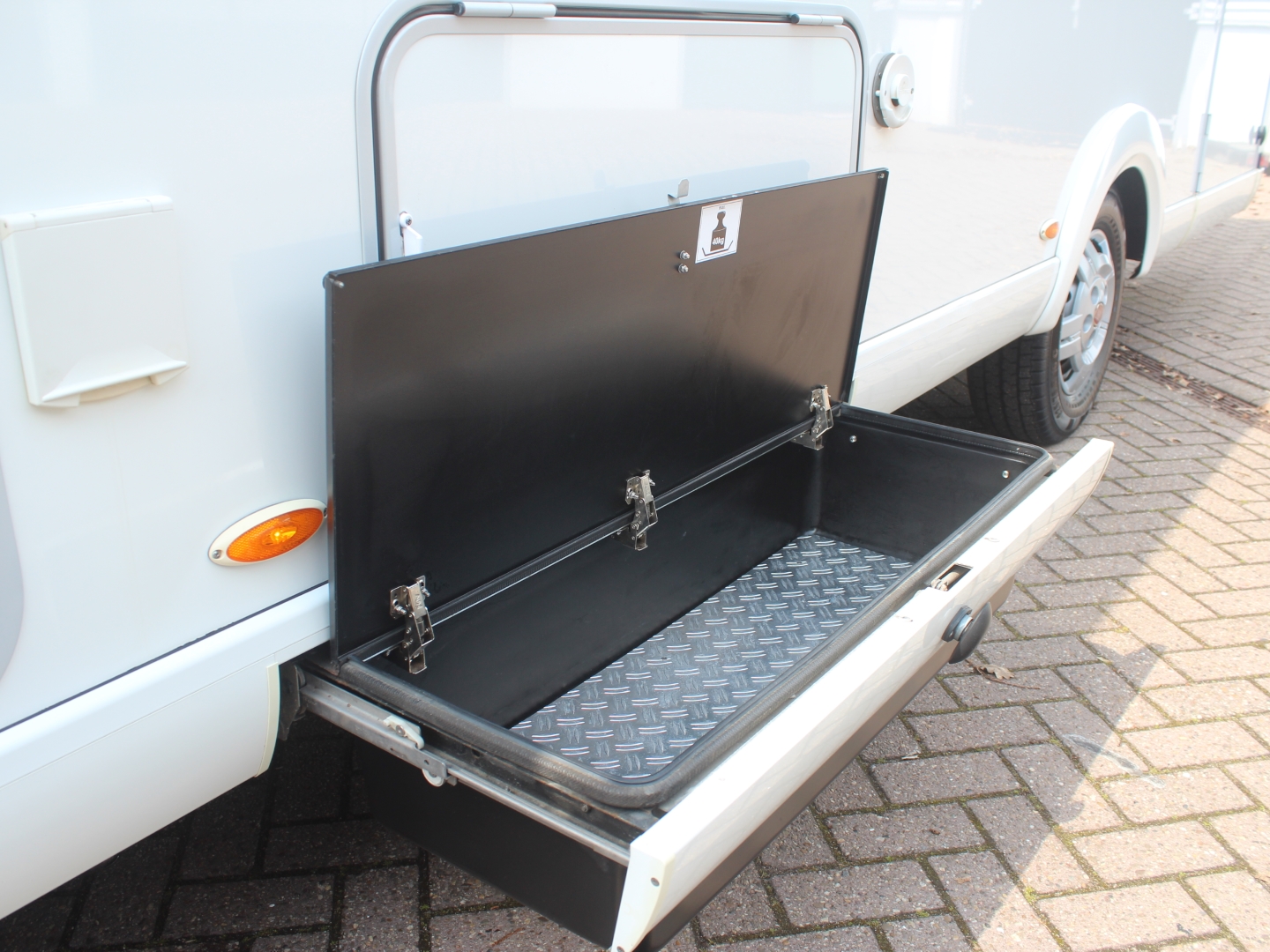 De camper heeft veel bergruimte in de ruime dubbele bodem bereikbaar dmv. verschillende luiken in de vloer. Het bevat tevens een grote garage, met aan beide zijden een grote deur, waarin uw fietsen en bagage veilig binnen geplaatst kunnen worden.