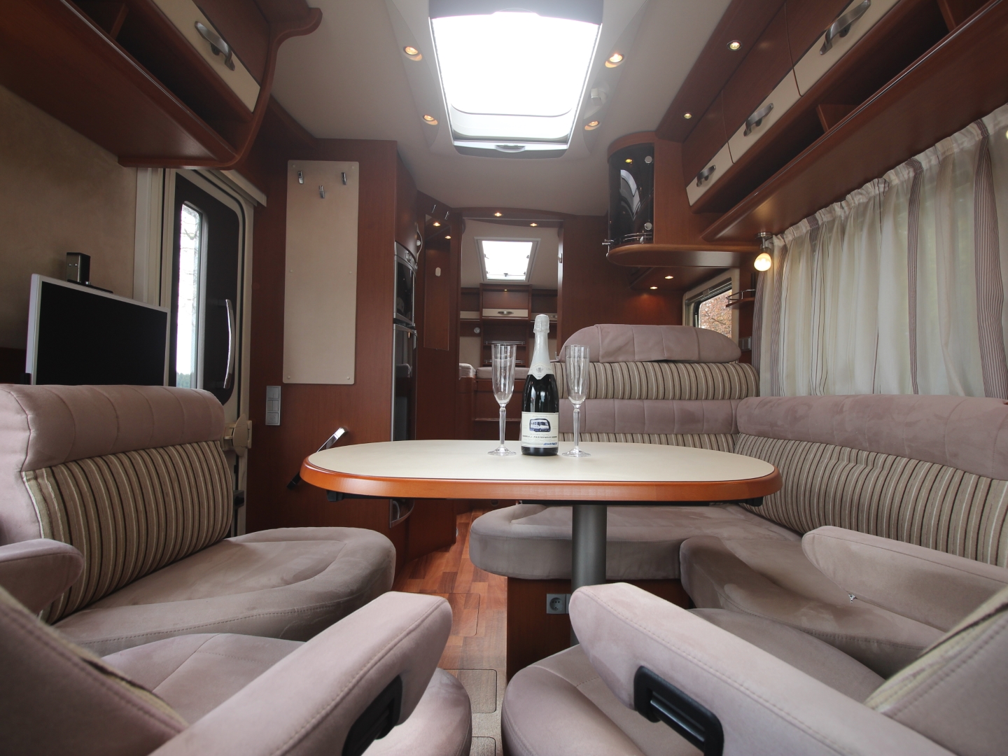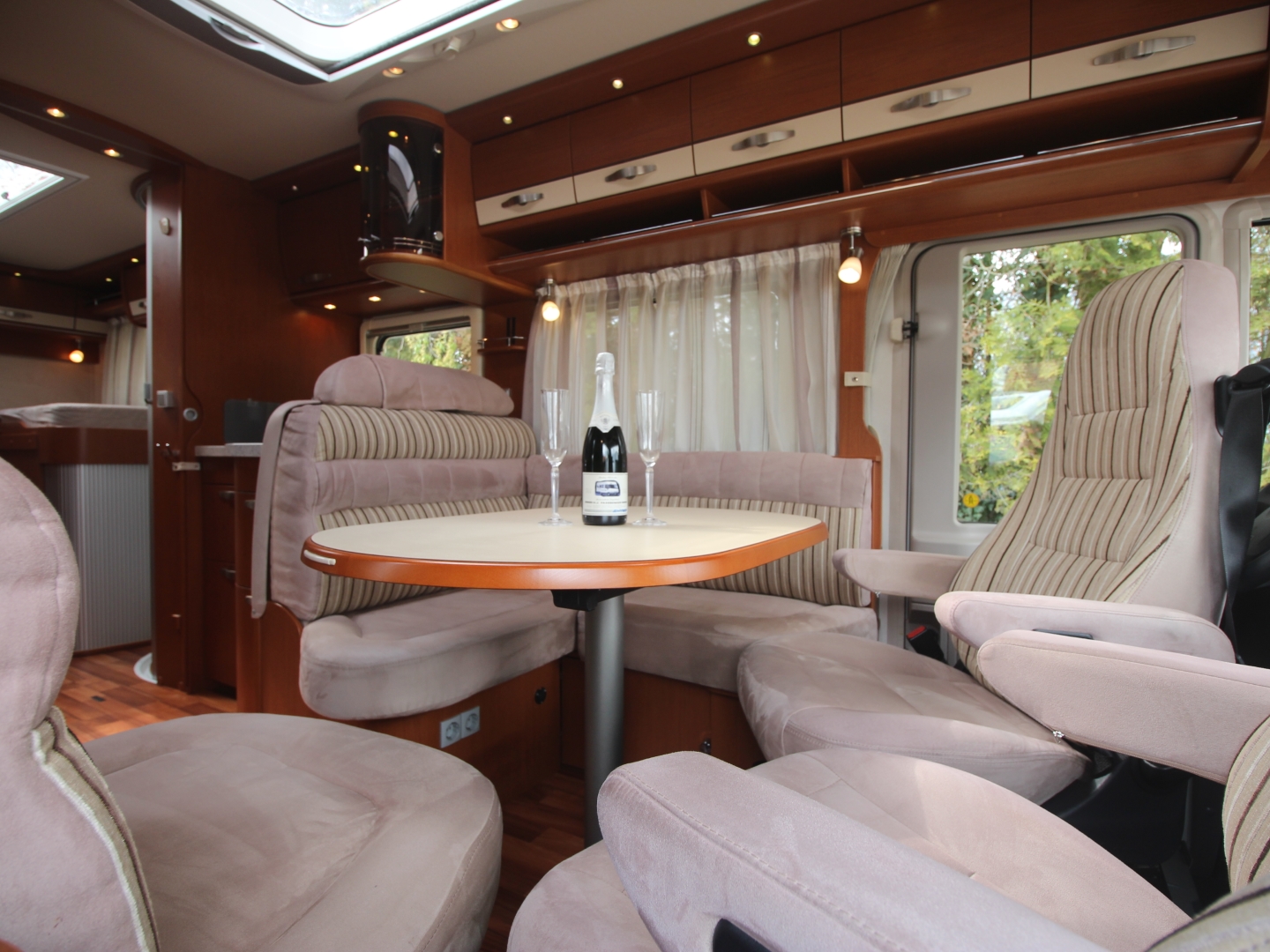 2 comfortabele Aguti Ergoflex pilotenstoelen in hoogte verstelbaar en kantelbaar, draaibaar naar een gezellige comfort L-zit met luxe salontafel. Schitterende bovenkastjes in de cabine, waar u rechtop kunt staan. Het interieur bestaat uit het stijlvolle Hymer 'Morello Select' meubilair met de luxe 'Lille' stofbekleding wat met de vele LED verlichting een bijzondere sfeer geeft. Cabineramen zijn voorzien van vouw- verduistering van hoogwaardig plisséstof en een electrisch rolluik bij het voorraam.
