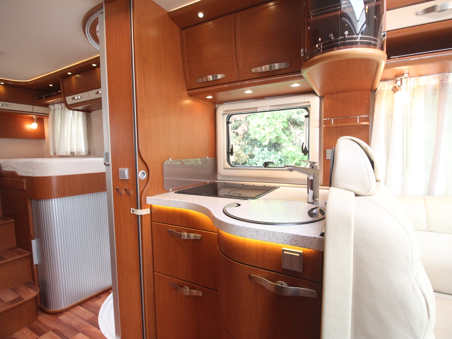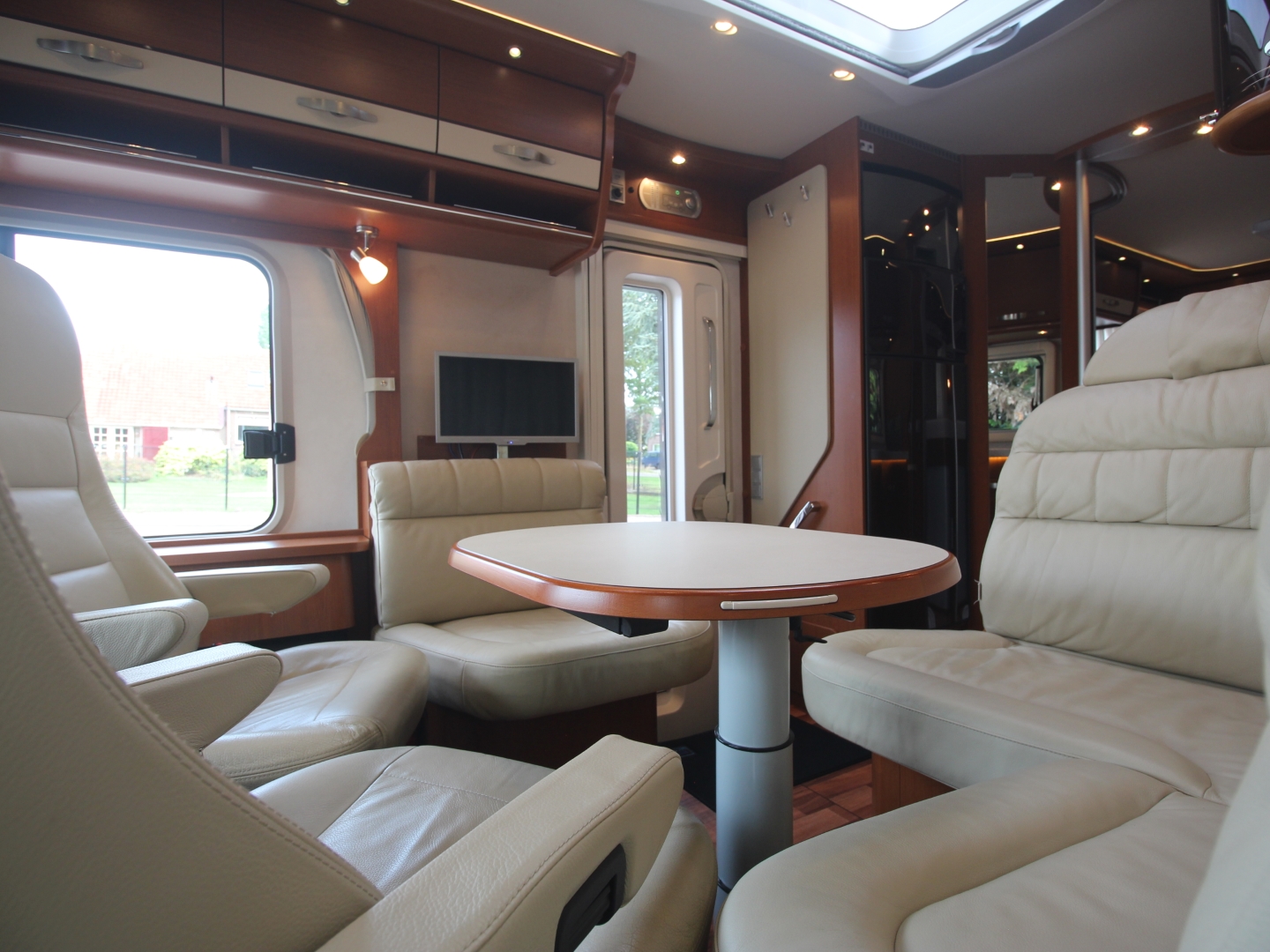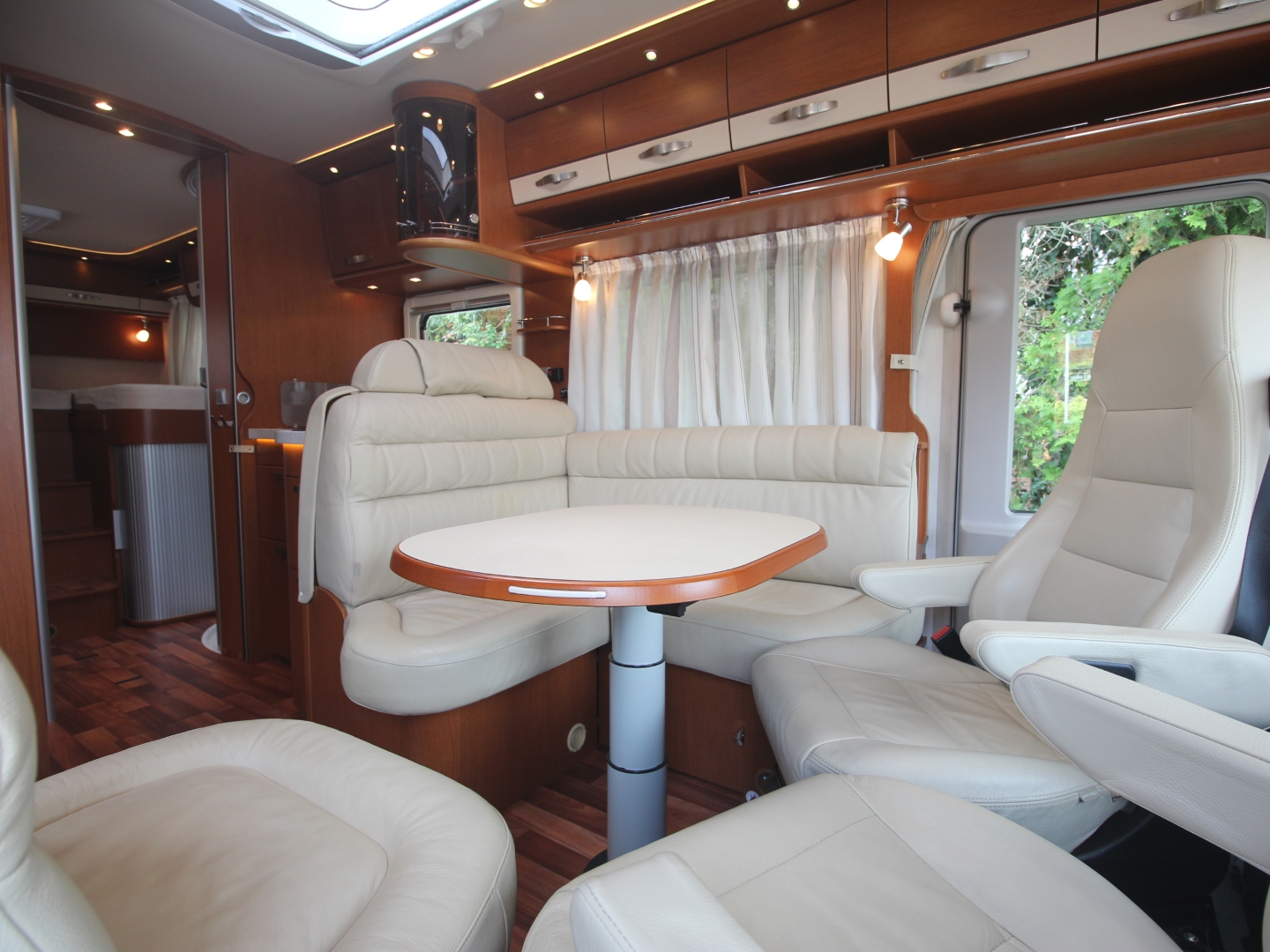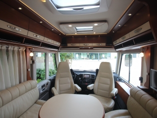2 comfortabele met leer beklede Aguti pilotestoelen, in hoogte verstelbaar en kantelbaar, draaibaar naar een gezellig comfort L-zit met luxe salontafel. Het interieur bestaat uit exclusief meubeldecor 'Palatino Apfel' in combinatie met de luxe leder Kiesel bekleding, waarbij met de vele LED verlichting een bijzondere sfeer ontstaat. Schitterende bovenkastjes in cabine waar u rechtop kunt staan. De comfort ingangs-deur is voorzien van een raam, schuifbare hor, en electrische opstap. Alle ramen zijn voorzien van vouwverduistering van hoogwaardige plisséstof, en bij het voorraam een elektrisch rolluik.