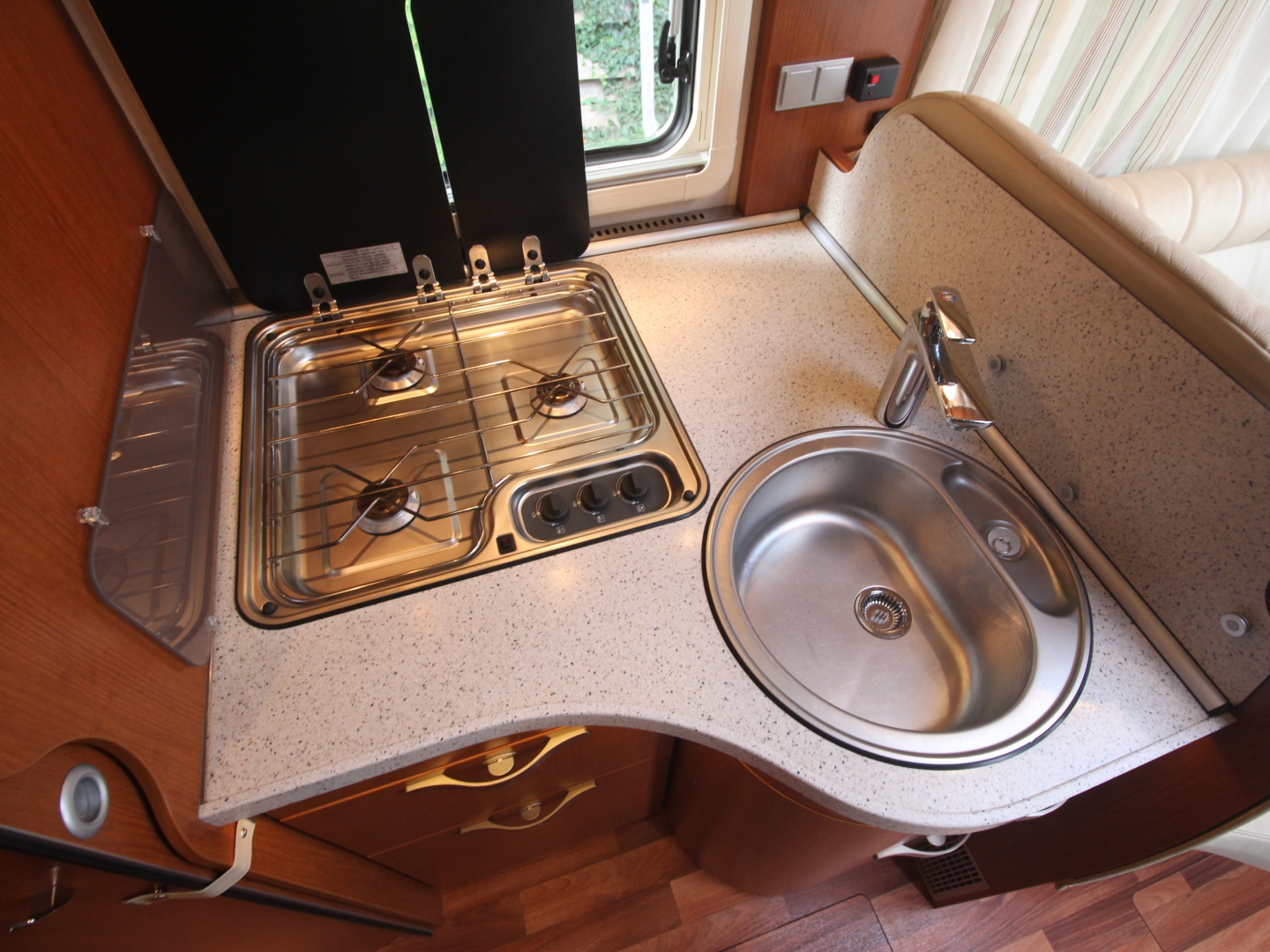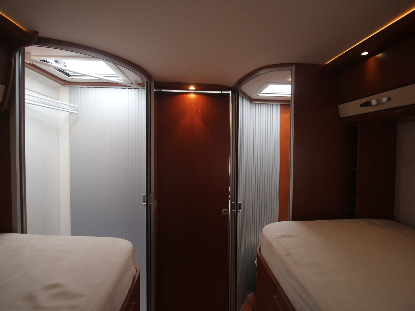 Het slaapgedeelte heeft 2 enkele bedden met binnenveringsmatras op lattenbodem waaronder zich 2 ruime (hang)kasten bevinden. Dit betreft een Hymer B serie en bevat een dubbele bodem met veel extra bergruimte bereikbaar door diverse luiken in de vloer. De camper is voorzien van het Truma Combi verwarming/boiler systeem met ringverwarming. De royale hoekkeuken bevat een spoelbak en 3 pits kooktoestel, diverse gelagerde laden met verrassend veel bergruimte voor kookgerei en boodschappen, en Dometic Tec Tower koelkast met aparte vriezer en luxe oven.