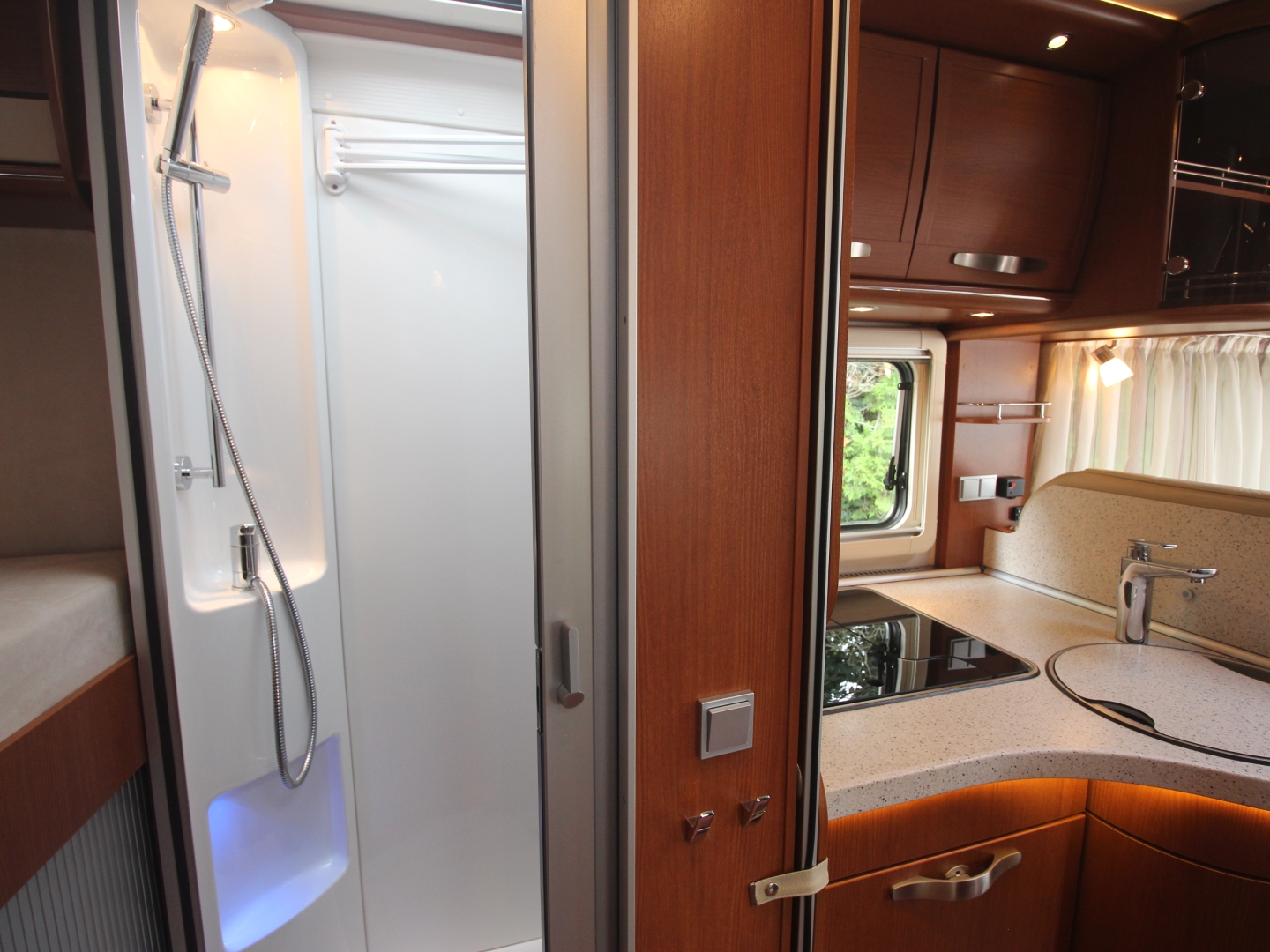 Links achterin bevind zich de ruime aparte douchecabine, en er tegenover het toilet Thetford met SOG automatische toilet ontluchting en extra kastruimte.