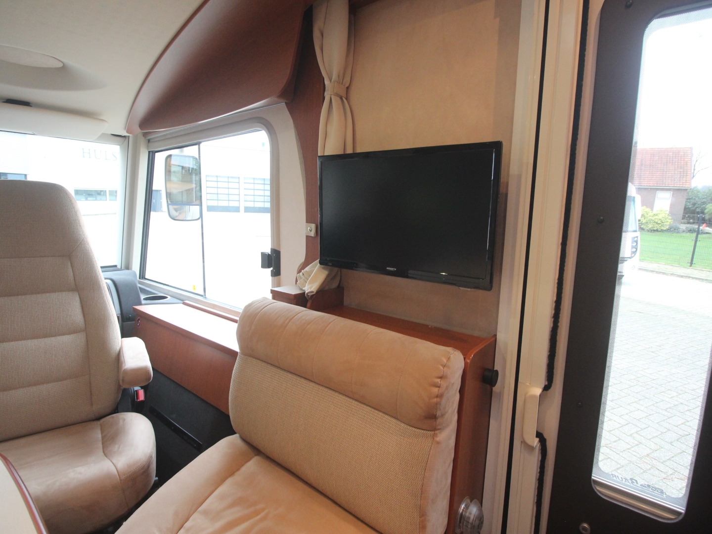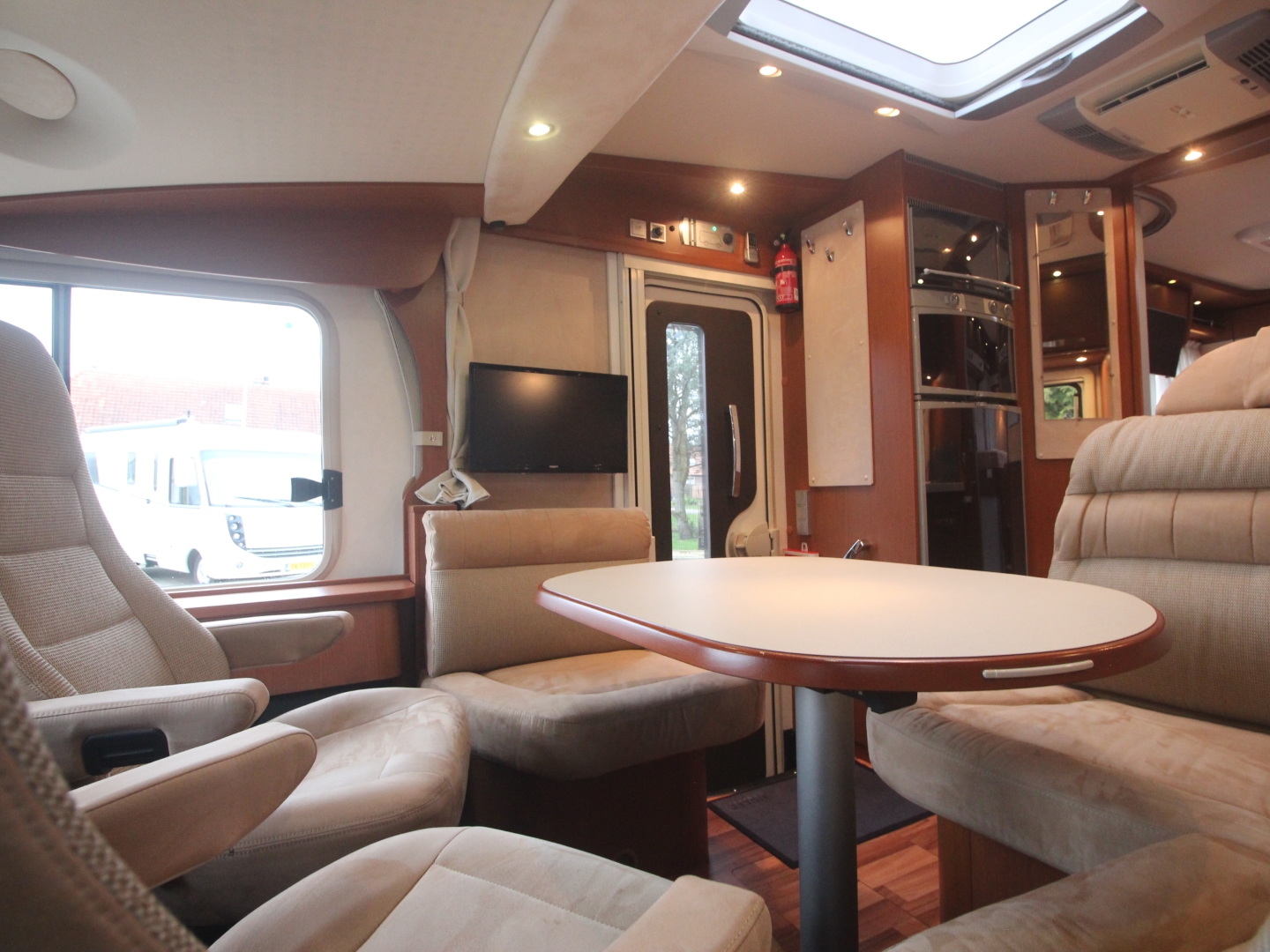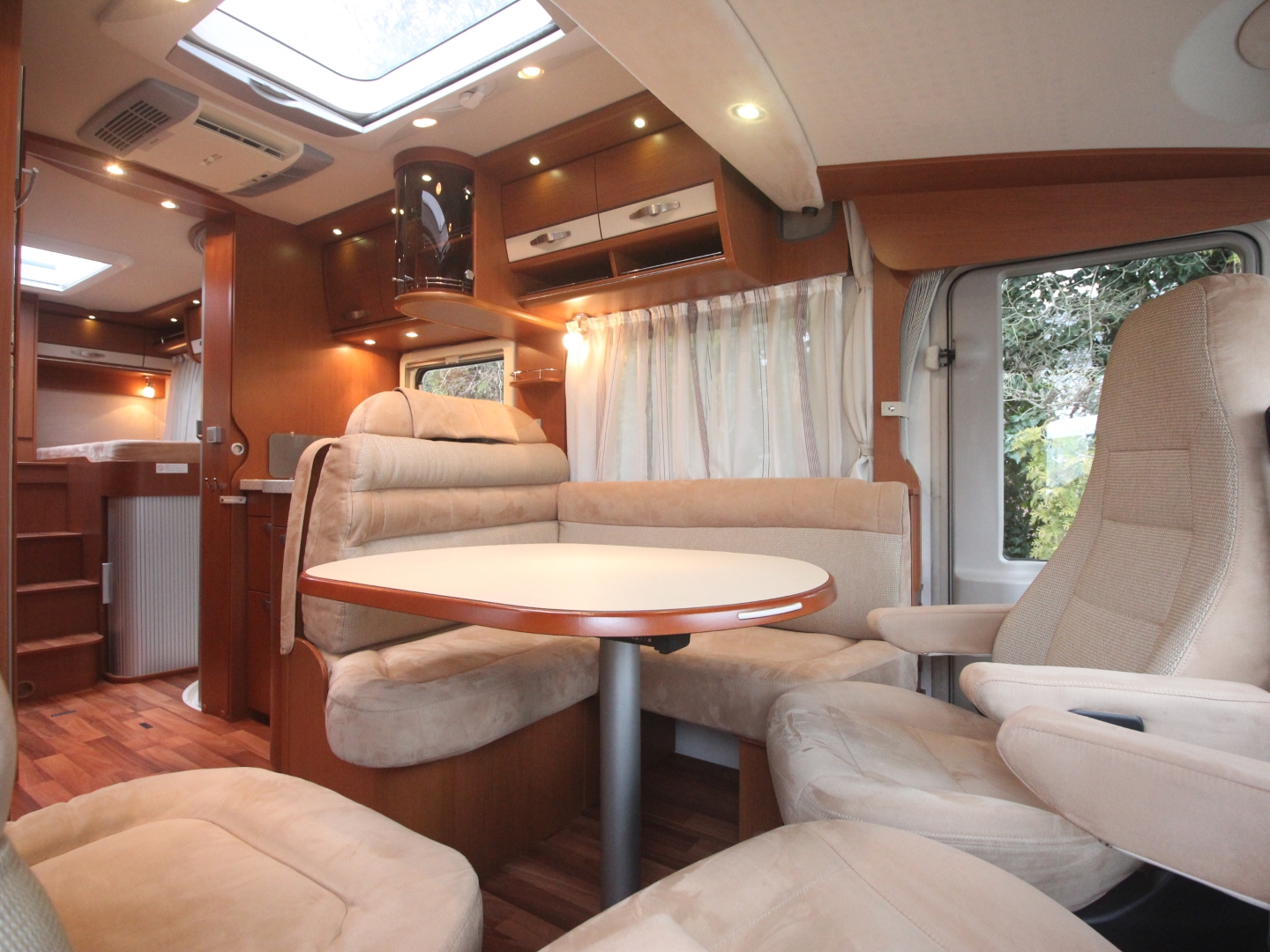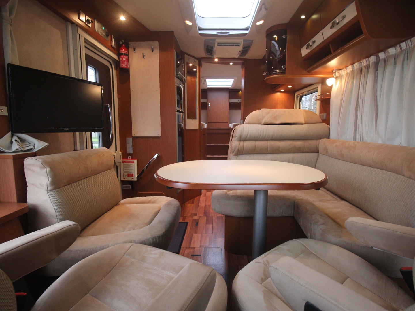2 comfortabele Aguti pilotestoelen, in hoogte verstelbaar en kantelbaar, draaibaar naar een gezellig comfort L-zit met luxe salontafel. Het interieur bestaat uit exclusief meubeldecor 'Palatino Apfel' in combinatie met de luxe alcantara bekleding, waarbij met de vele LED verlichting een bijzondere sfeer ontstaat. De comfort ingangs-deur is voorzien van een raam, schuifbare hor, en elektrische opstap. Alle ramen zijn voorzien van vouwverduistering van hoogwaardige plisséstof, en bij het voorraam een elektrisch rolluik.