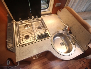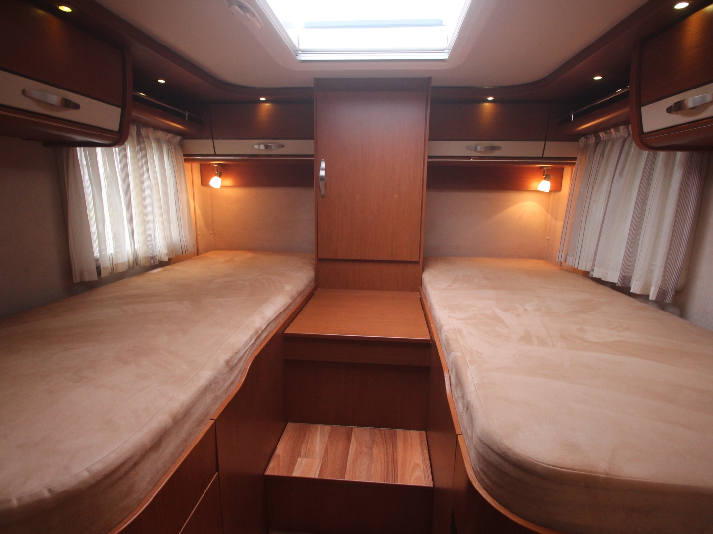 Het slaapgedeelte heeft 2 enkele bedden met binnenveringsmatras op lattenbodem waaronder zich 2 ruime (hang)kasten bevinden. Dit betreft een Hymer B serie en bevat een dubbele bodem met veel extra bergruimte bereikbaar door diverse luiken in de vloer. De camper is voorzien van het Truma Combi verwarming/boiler systeem met ringverwarming. De royale hoekkeuken bevat een spoelbak en 3 pits kooktoestel, diverse gelagerde laden met verrassend veel bergruimte voor kookgerei en boodschappen, en Dometic Tec Tower koelkast met aparte vriezer en luxe oven.