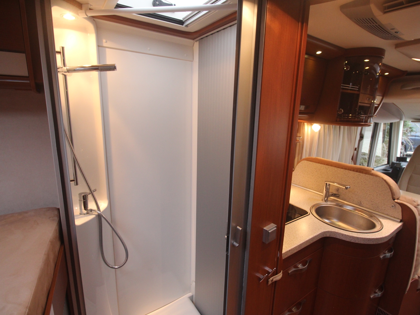 Links achterin bevind zich de ruime aparte douchecabine, en er tegenover het toilet Thetford met SOG automatische toilet ontluchting en extra kastruimte.