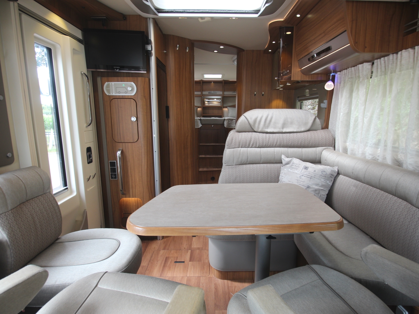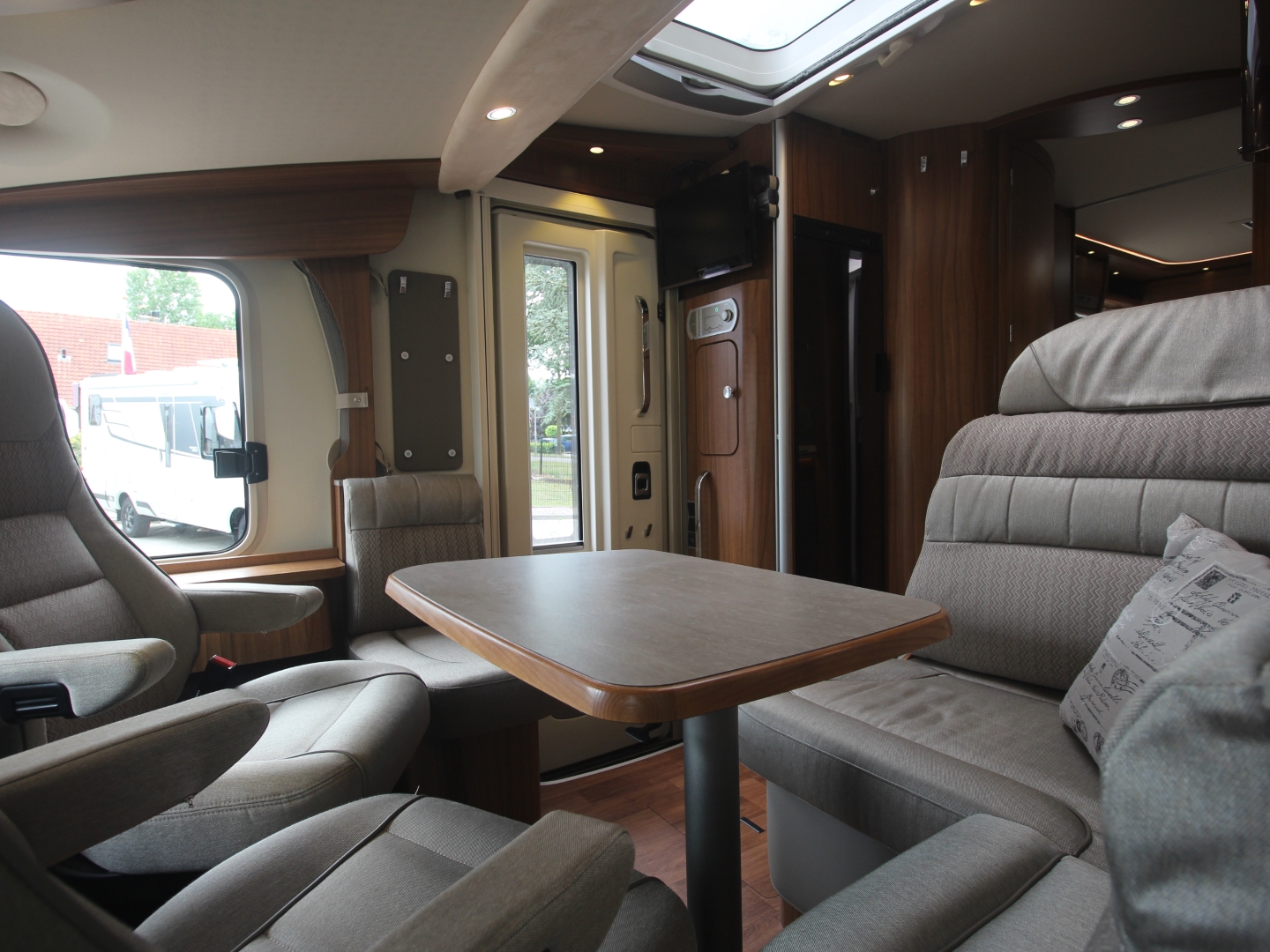 2 comfortabele in hoogte verstelbare Aguti pilotestoelen, draaibaar naar een gezellig comfort L-zit met luxe salontafel. Het interieur bestaat uit exclusief meubeldecor 'Palatino Apfel' met unieke stijl Premium Line in combinatie met de luxe stofbekleding 'Messina' waarbij met de vele LED verlichting een bijzondere sfeer onstaat. De extra brede comfort ingangs-deur is voorzien van een raam, schuifbare hor en elektrische opstap.