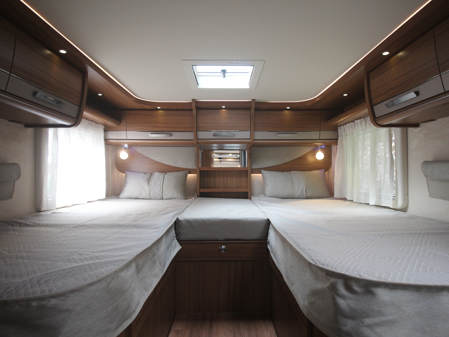 Het slaapgedeelte heeft 2 enkele bedden met het Hymer slaapcomfort systeem met koudschuimmatras op schotelsysteem, ( om te leggen naar 1 groot bed) waaronder zich 2 ruime (hang)kasten bevinden. Boven in de cabine een royaal 2 persoons hefbed. Dit betreft een Hymer B serie en bevat een dubbele bodem met veel extra bergruimte bereikbaar door diverse luiken in de vloer. De camper is voorzien van Truma CP Plus verwarming/boiler met thermostatisch bedieningspaneel en het verwarmingsconcept, waarbij het dashboard een warmtegordijn creëert. De royale hoekkeuken bevat een spoelbak en 3 pits kooktoestel, diverse gelagerde laden met verrassend veel bergruimte voor kookgerei en boodschappen, en koelkast Smart Tower 142 L met vriesvak.