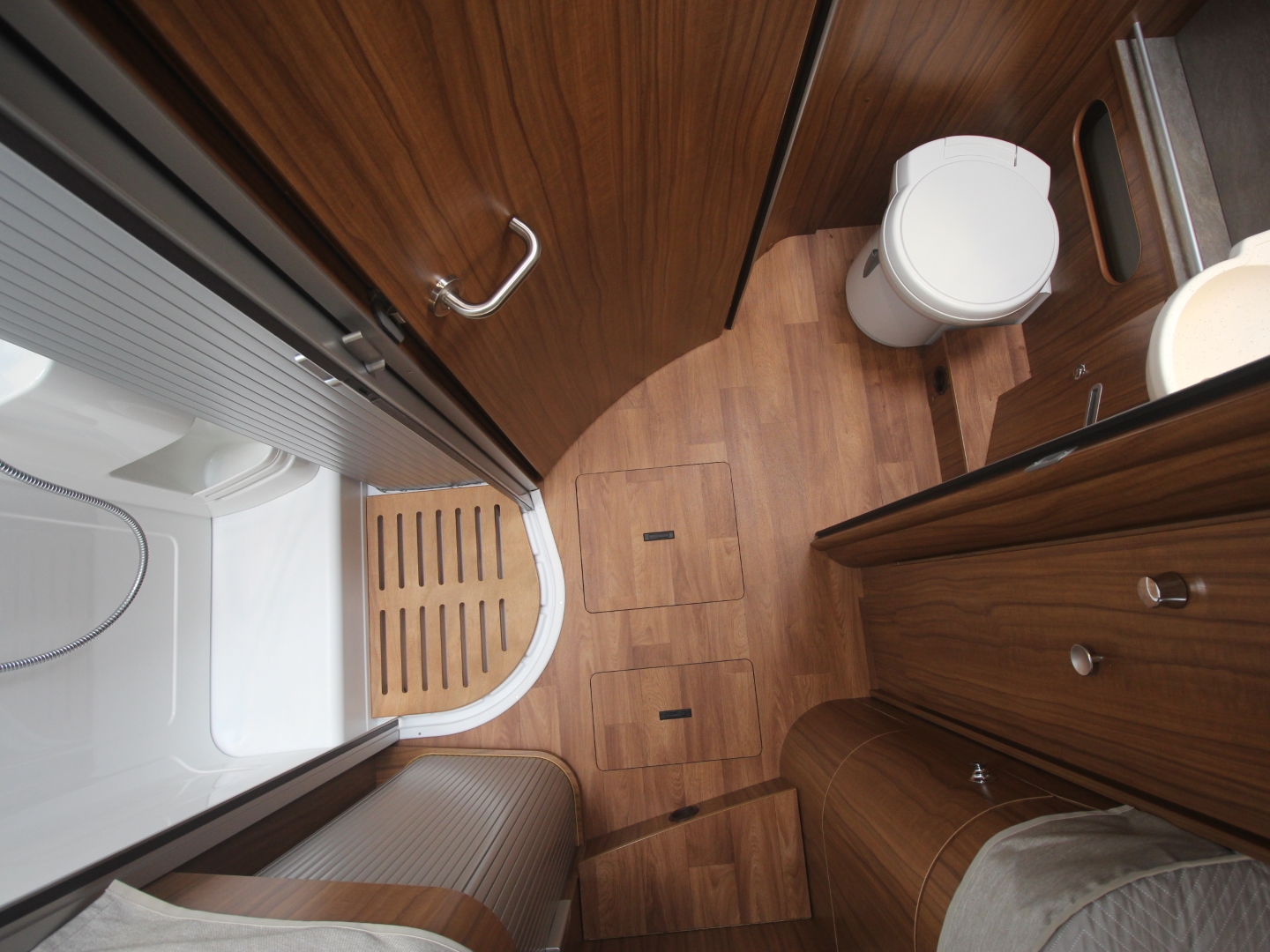 Links achterin bevind zich de ruime aparte douchecabine, en er tegenover het toilet Thetford met SOG automatische toilet ontluchting en extra kastruimte.