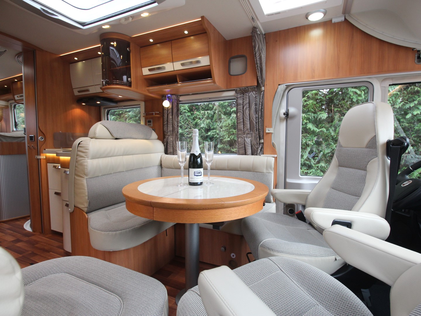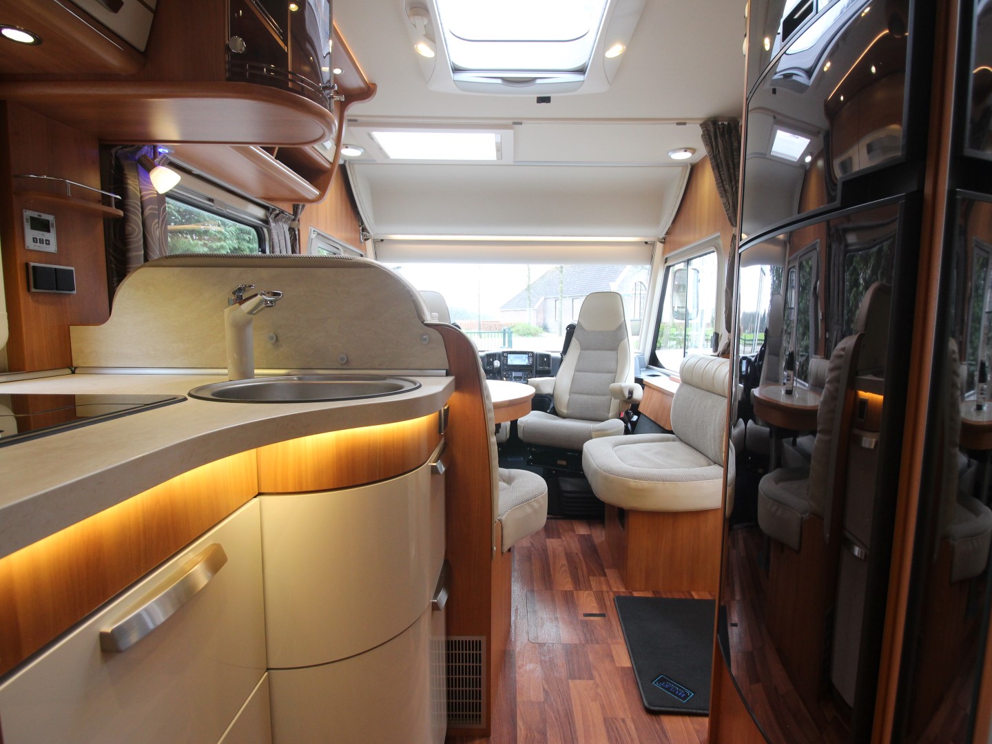 2 comfortabele Aguti Ergoflex pilotestoelen in hoogte verstelbaar en kantelbaar, draaibaar naar een gezellige comfort L-zit met luxe uitschuifbare salontafel. Het interieur bestaat uit uniek Hymer 'Morello Select' meubeldecor met de luxe leer/stof bekleding wat met de vele LED verlichting een bijzondere sfeer geeft. Alle ramen zijn voorzien van plissévouwverduistering van hoogwaardige plisséstof, en een elektrisch rolluik bij het voorraam.