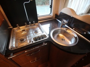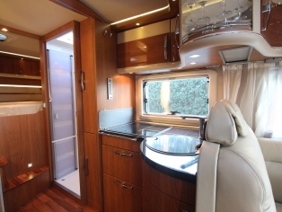 De comfort ingangsdeur is voorzien van een raam, schuifbare hordeur, en een elektrisch en geïntegreerde opstap. De royale hoekkeuken bevat een spoelbak en 3 pits kooktoestel met ontstekingsautomaat, afzuigkap, diverse gelagerde laden met verrassend veel bergruimte voor het kookgerei en boodschappen, grote Dometic Tec Tower koelkast met apart vriezer en luxe bakoven.