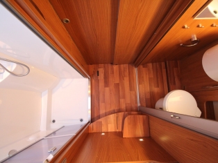 De ruime badkamer met wastafel heeft een Thetford toilet met SOG, extra kastruimte en een aparte grote douchecabine. Naast de badkamer zijn twee grote hangkasten voor kleding.