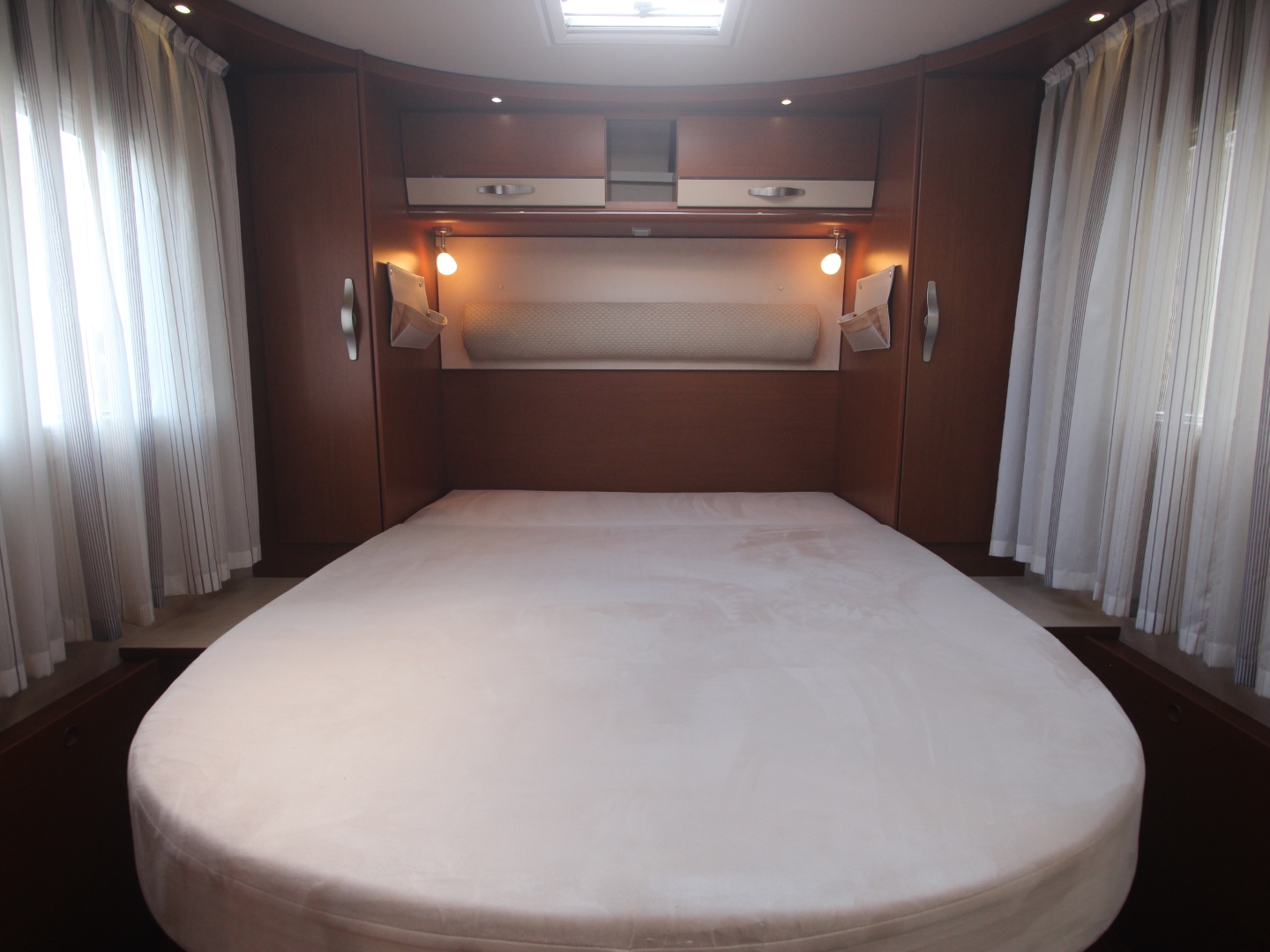 Het slaap gedeelte heeft achter een makkelijk toegankelijk royaal eilandbed, met binnenverings matras op lattenbodem en groot panoramadakluik erboven.