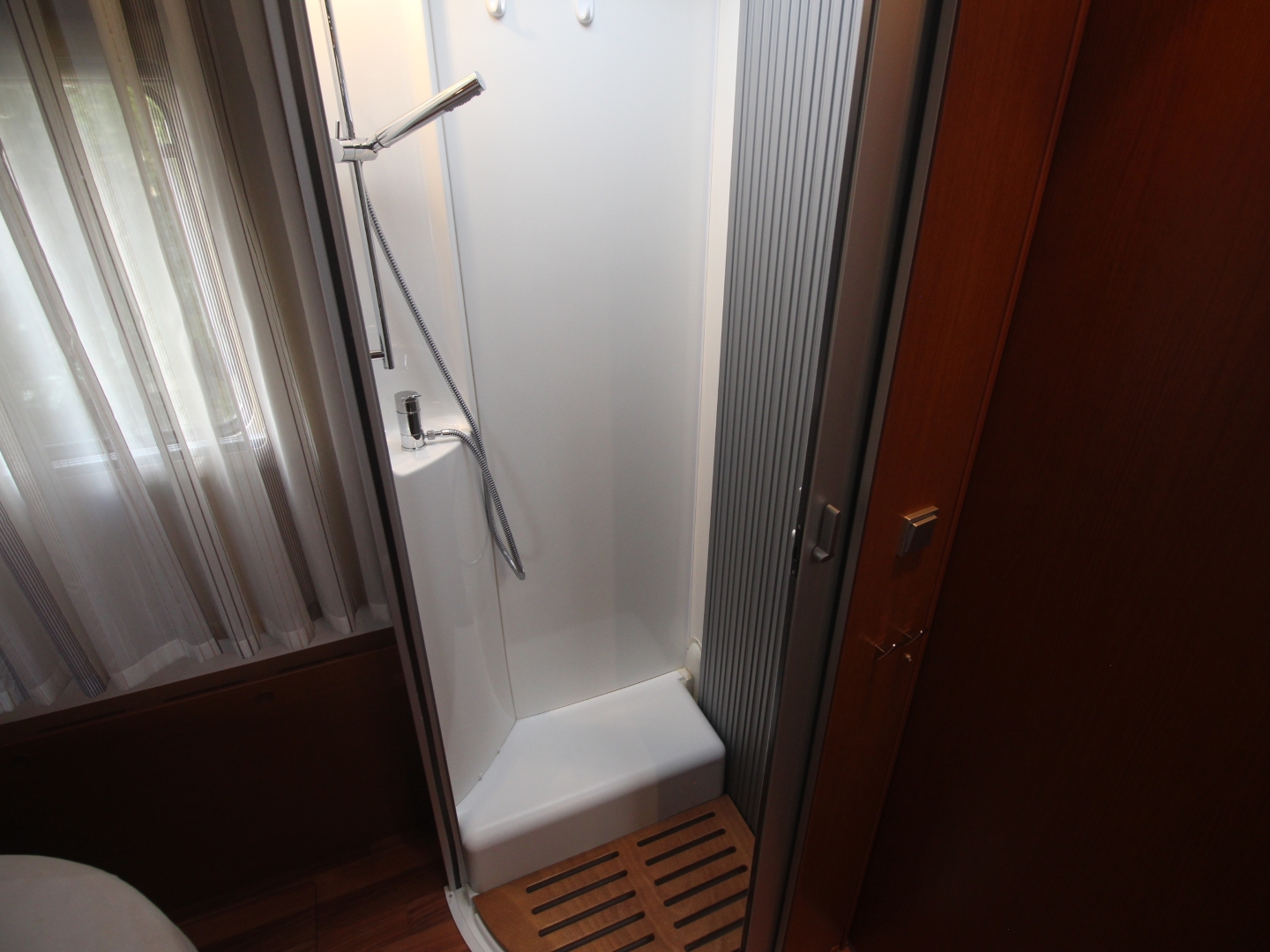 Links achterin bevind zich de ruime douchecabine, en er tegenover het toilet Thetford met SOG automatische toilet ontluchting en extra kastruimte.