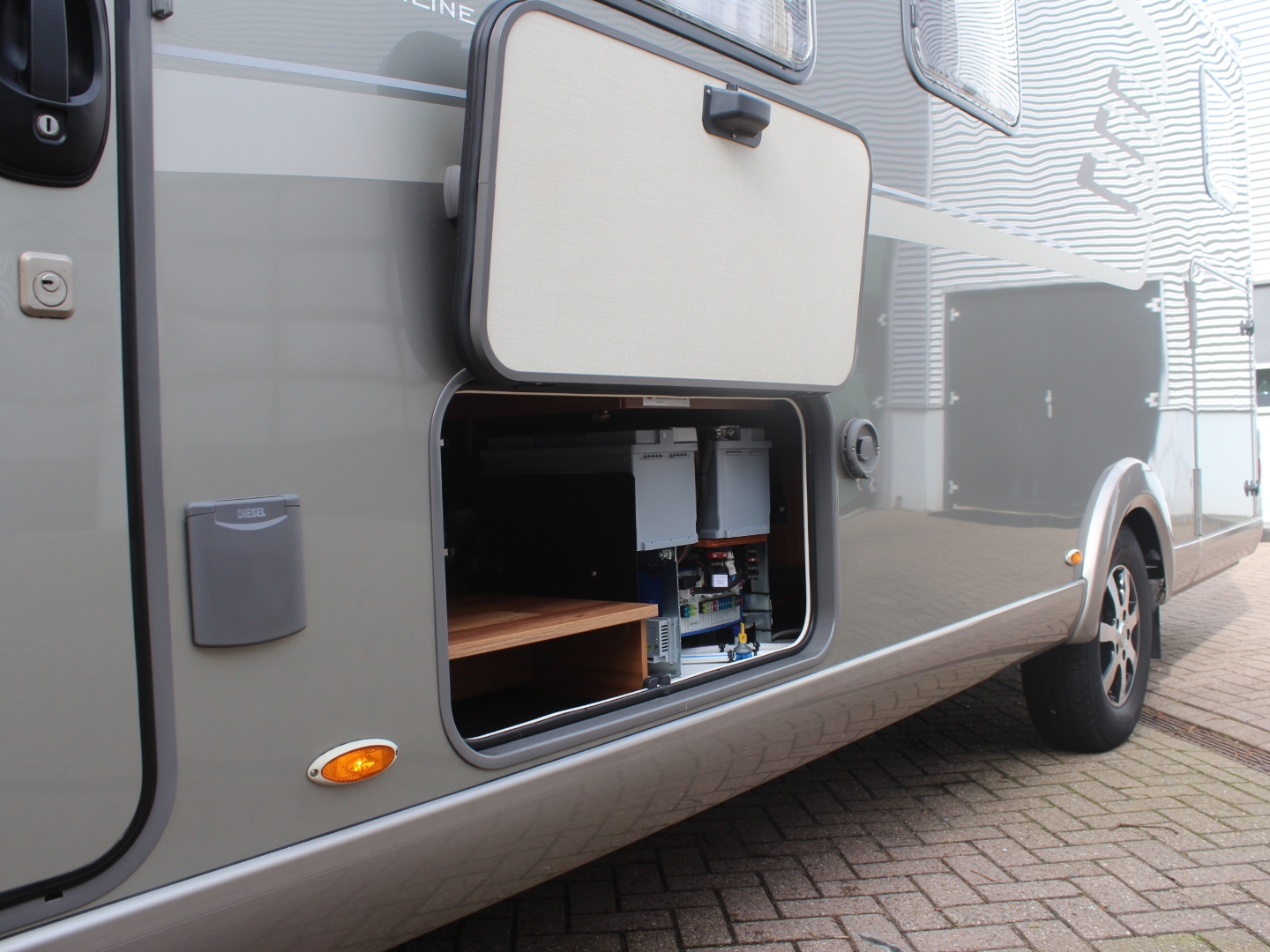 De 160 ltr schoon - en 140 ltr vuilwatertank bevinden zich in de (verwarmde) dubbele vloer. De fietsen plaatst u in de grote (met vilt beklede) garage op de fietsendrager, bereikbaar dmv. een grote deur links en rechts, waarbij voldoende ruimte overblijft voor andere bagage.