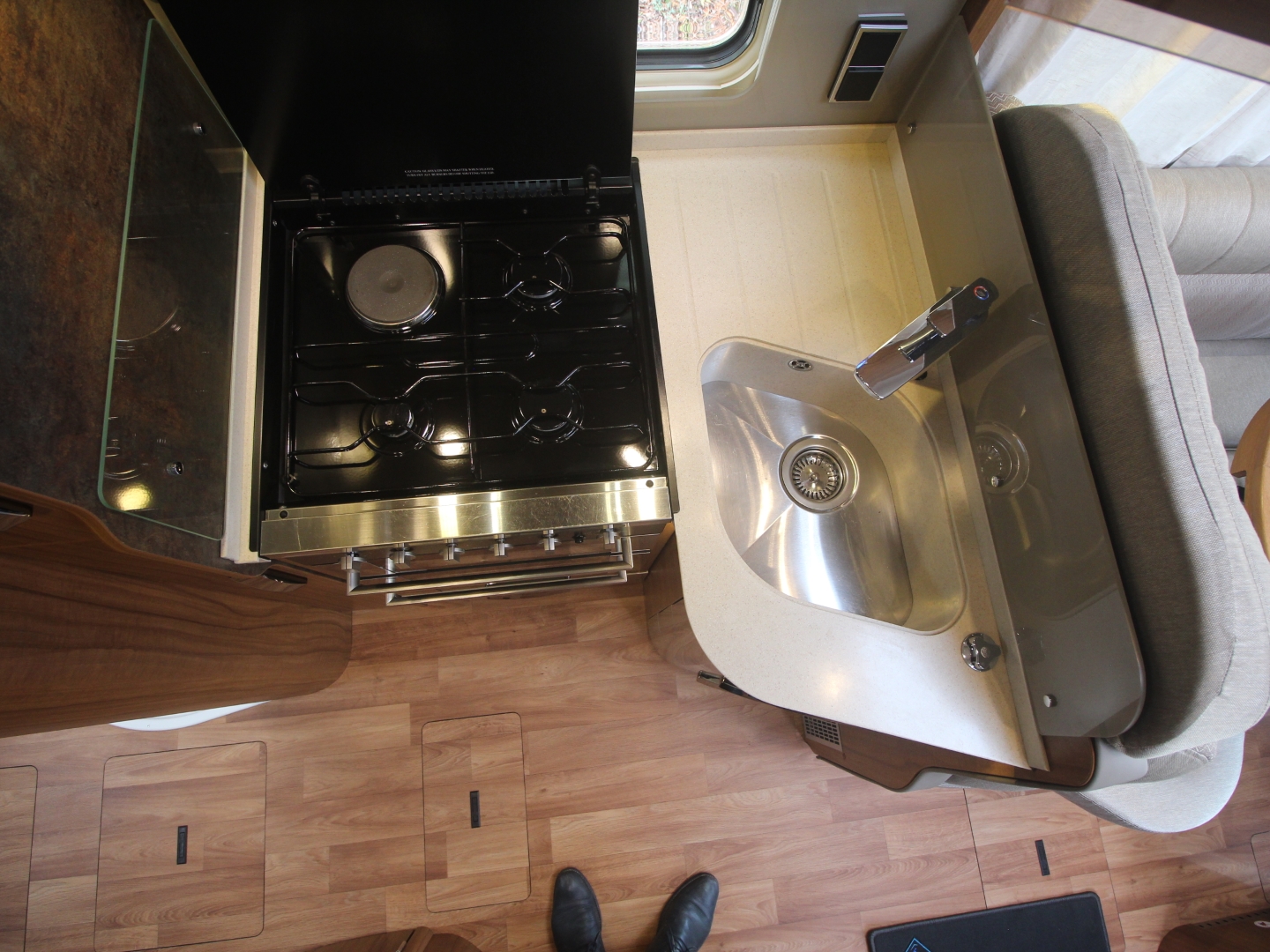 Het slaapgedeelte heeft 2 enkele bedden met het Hymer slaapcomfort systeem met koudschuimmatras op schotelsysteem, ( om te leggen naar 1 groot bed) waaronder zich 2 ruime (hang)kasten bevinden. Boven in de cabine een royaal 2 persoons hefbed. Dit betreft een Hymer B serie en bevat een dubbele bodem met veel extra bergruimte bereikbaar door diverse luiken in de vloer. De camper is voorzien van ALDE vloeistofverwarming met warmtewisselaar. De royale hoekkeuken bevat een spoelbak en het Thetford K1520 fornuis met 3 gasbranders en een electrische kookplaat, heteluchtoven en ruime grill. Het bevat diverse gelagerde laden met verrassend veel bergruimte voor kookgerei en boodschappen, en koelkast Smart Tower 142 L met vriesvak.