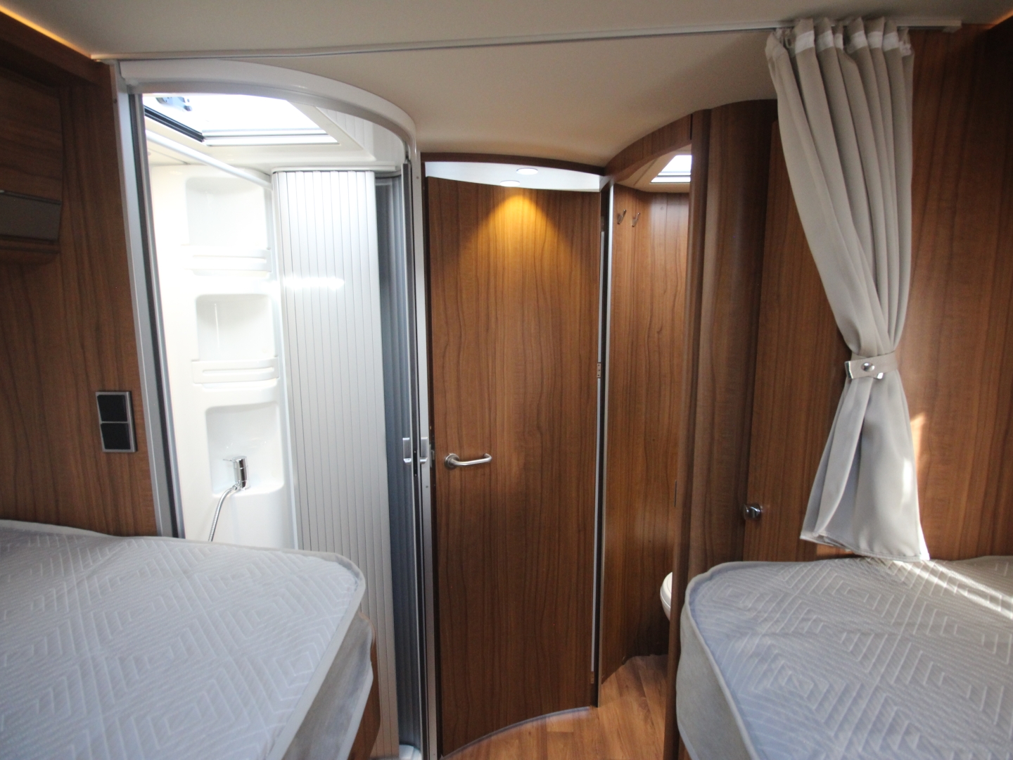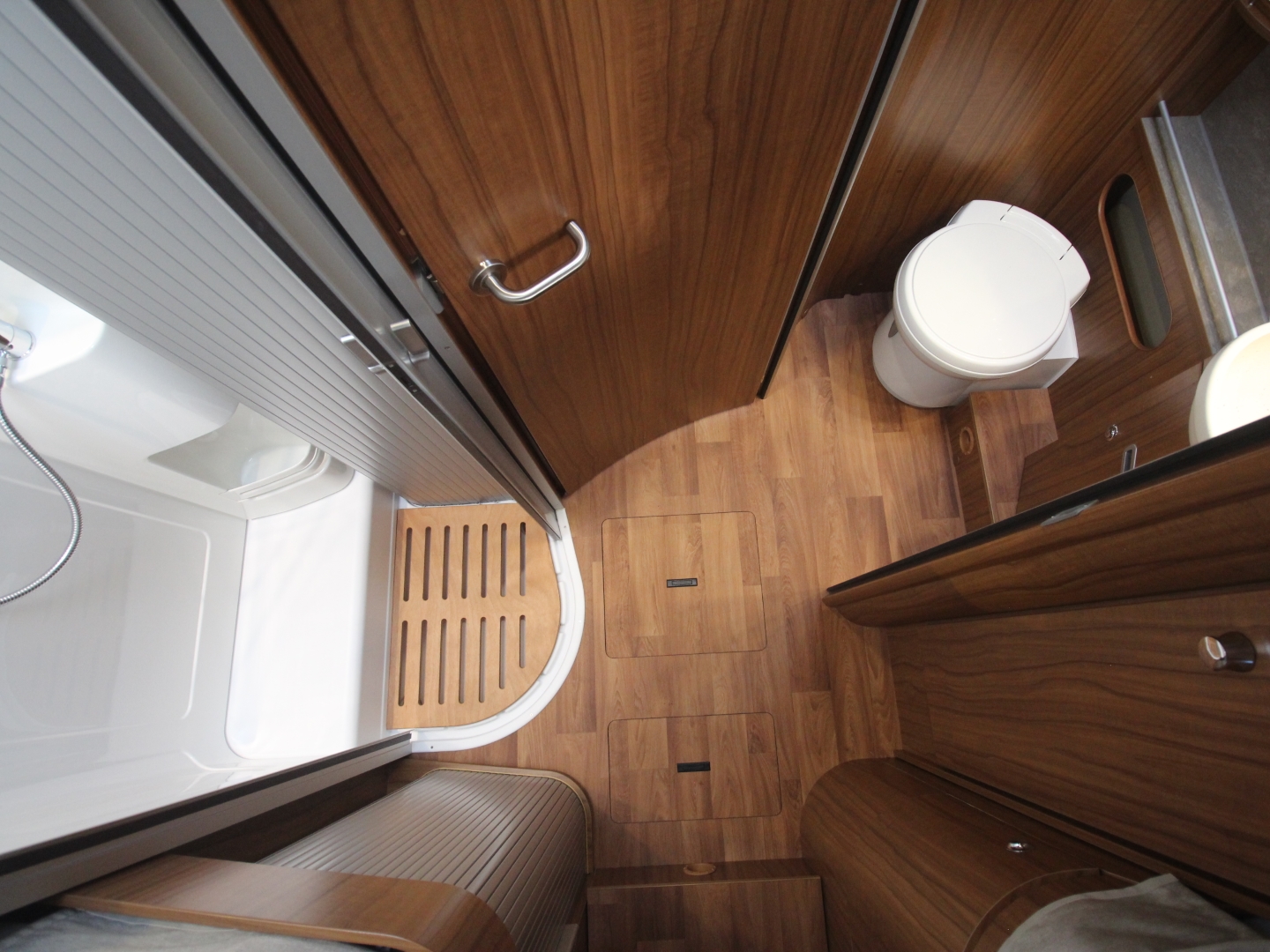 Links achterin bevind zich de ruime aparte douchecabine, en er tegenover het toilet Thetford met extra kastruimte.