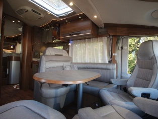 2 comfortabele in hoogte verstelbare en kantelbare Aguti pilotestoelen, draaibaar naar een gezellig comfort L-zit met luxe salontafel. Het interieur bestaat uit exclusief meubeldecor 'Palatino Apfel' met unieke stijl Premium Line in combinatie met de luxe stofbekleding waarbij met de vele LED verlichting een bijzondere sfeer ontstaat. De extra brede comfort ingangs-deur is voorzien van een raam, schuifbare hor, en elektrisch bedienbare opstap.