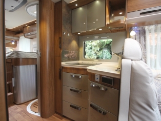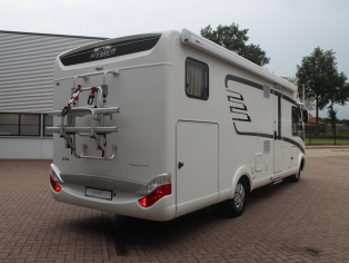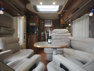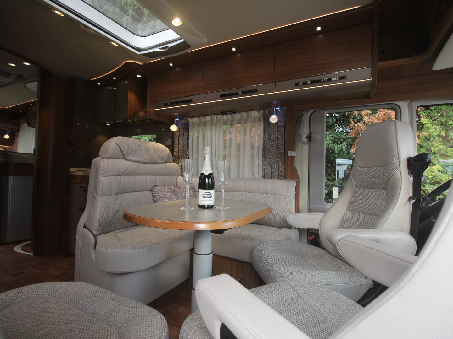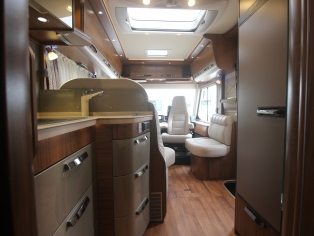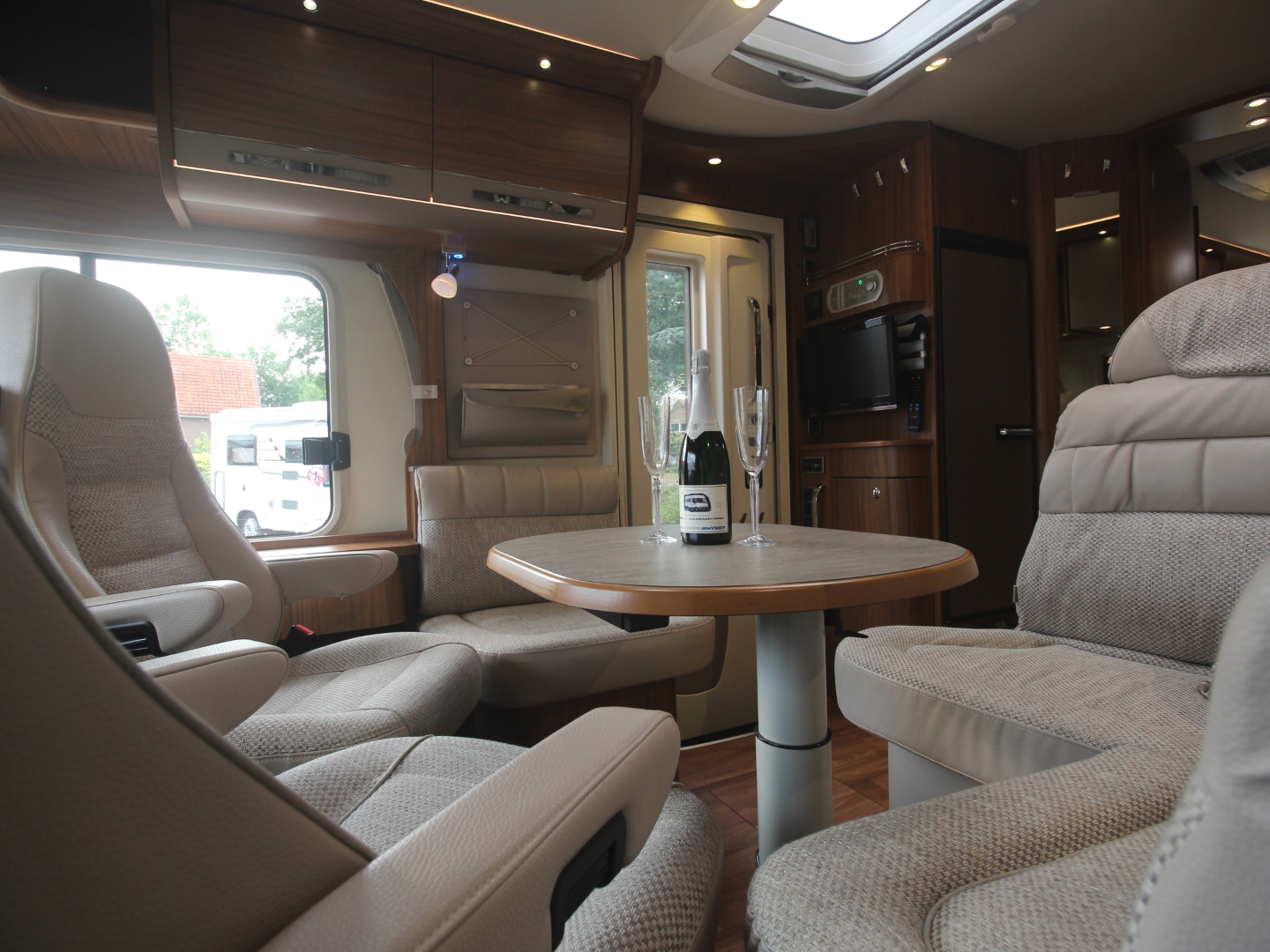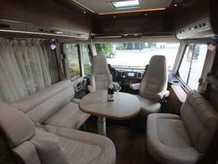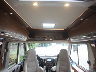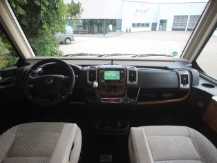 2 comfortabele in hoogte verstelbare en kantelbare Aguti pilotestoelen, draaibaar naar een gezellig comfort L-zit met luxe salontafel. Het interieur bestaat uit exclusief meubeldecor 'Palatino Apfel' met unieke stijl Premium Line in combinatie met de luxe stofbekleding met lederinleg waarbij met de vele LED verlichting een bijzondere sfeer ontstaat. Schitterende bovenkastjes in de cabine waar u rechtop kunt staan. De extra brede comfort ingangs-deur is voorzien van een raam, schuifbare hor, extra Abus veiligheids-slot en electrisch bedienbare opstap.