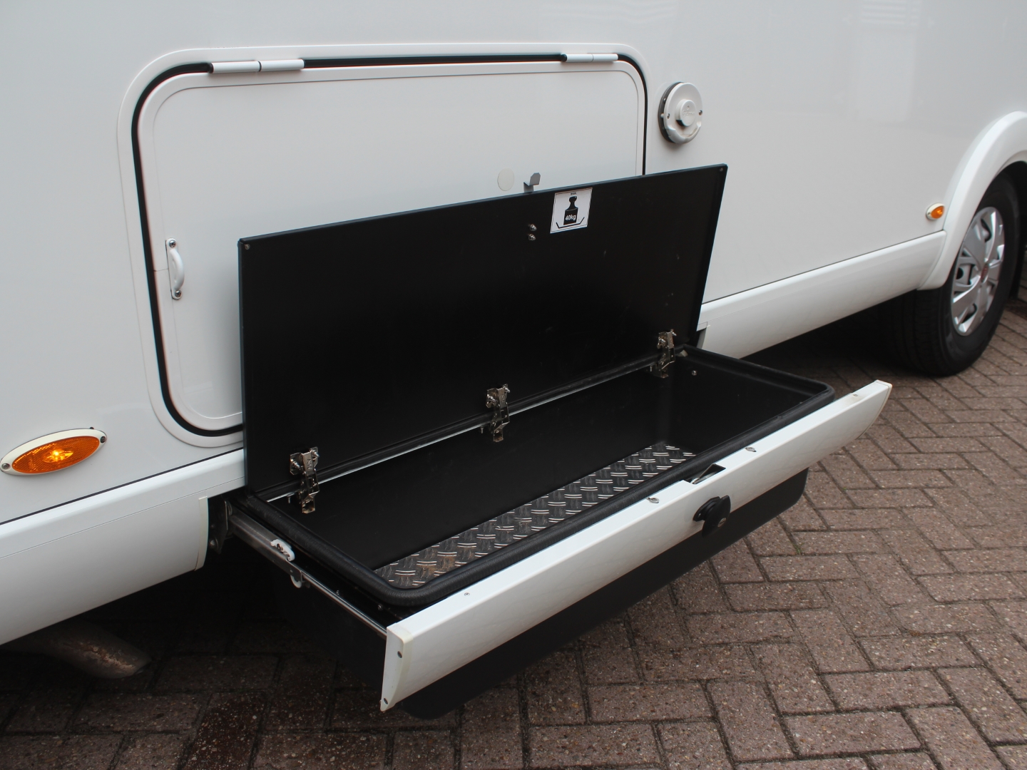 De 160 ltr schoon - en 140 ltr vuilwatertank bevinden zich in de (verwarmde) dubbele vloer. De grote garage heeft een hoogte van 1.20m, en is bereikbaar dmv. een grote deur links en rechts.