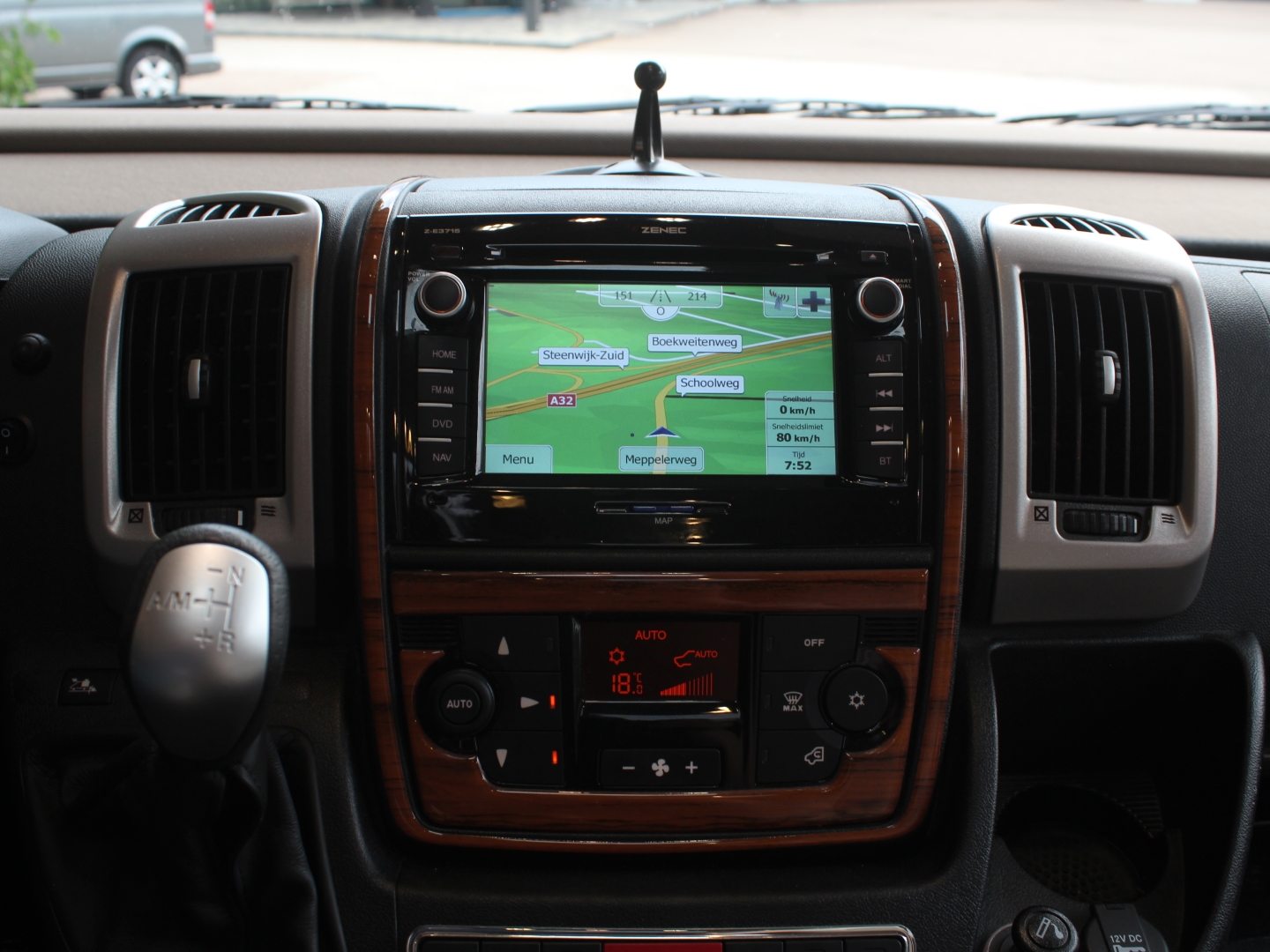 Het dashboard in luxe houtdecor met een Zenec multimediasysteem, navigatie, achteruitrijcamera met dubbele lens, bestuurders en bijrijdersairbag, electrisch bedienbare spiegels en ramen.