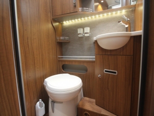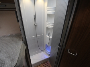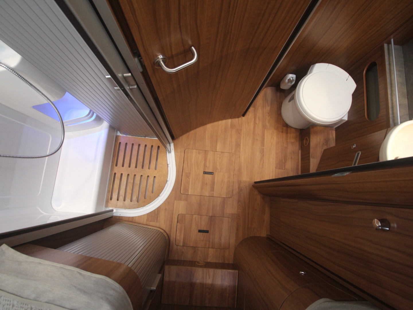 Links achterin bevind zich de ruime aparte douchecabine, en er tegenover het toilet Thetford met SOG automatische toilet ontluchting en extra kastruimte.