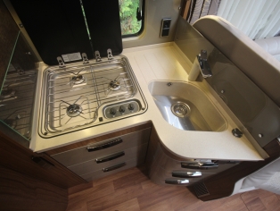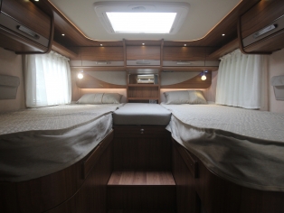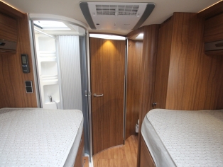 Het slaapgedeelte heeft 2 enkele bedden met het Hymer slaapcomfort systeem met koudschuimmatras op schotelsysteem, ( om te leggen naar 1 groot bed) waaronder zich 2 ruime (hang)kasten bevinden. Dit betreft een Hymer B serie en bevat een dubbele bodem met veel extra bergruimte bereikbaar door diverse luiken in de vloer. De camper is voorzien van het Truma plus verwarmingsysteem. De royale hoekkeuken bevat een spoelbak en 3 pits kooktoestel met electrische ontsteking. Het bevat diverse gelagerde laden met verrassend veel bergruimte voor kookgerei en boodschappen, en koelkast Smart Tower 142 L met vriesvak.