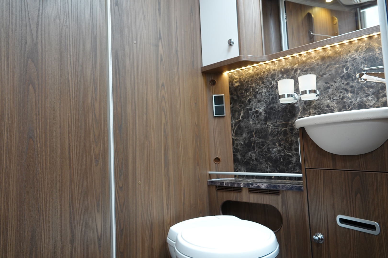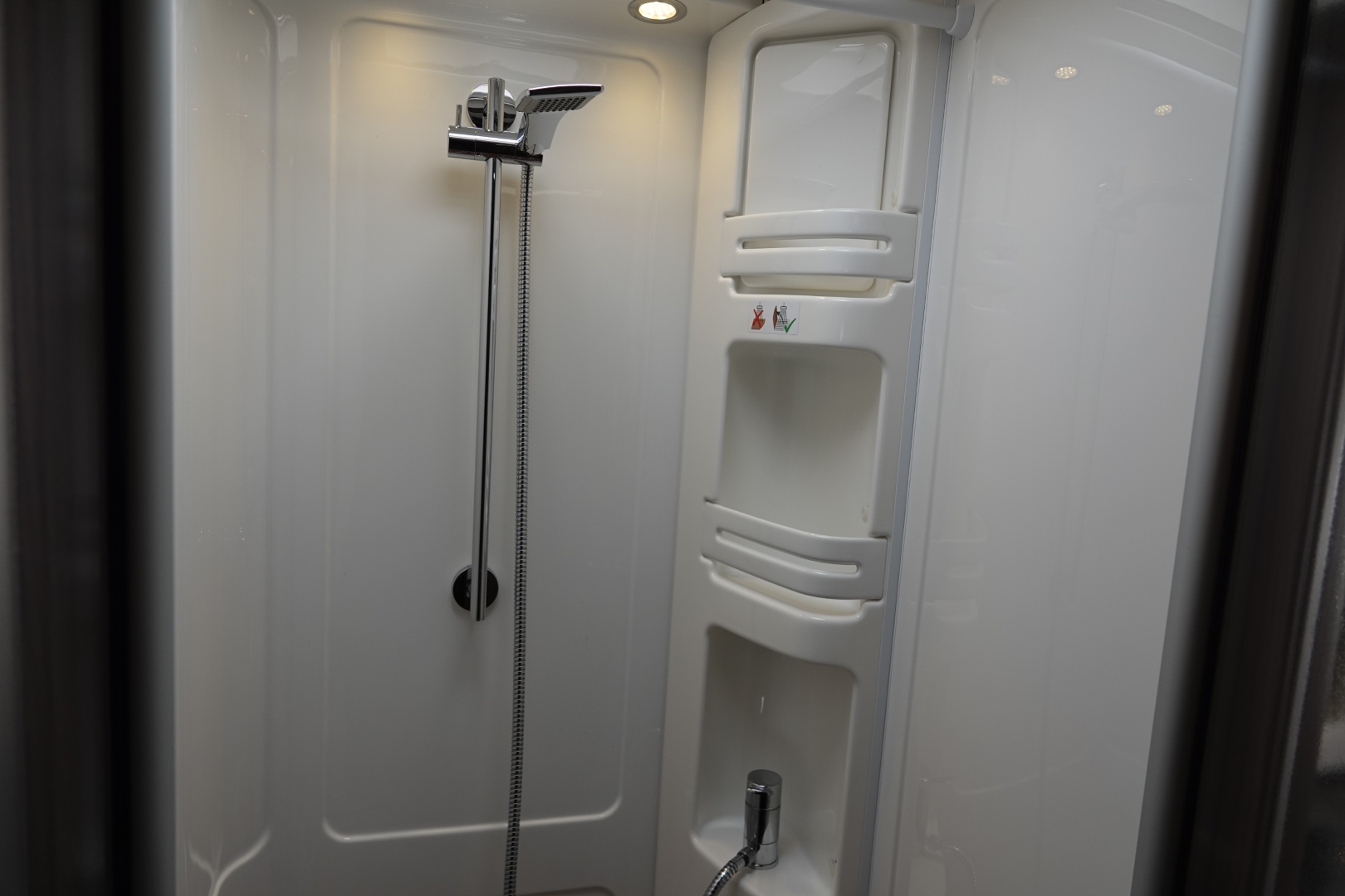 Links achterin bevind zich de ruime douchecabine, en er tegenover het toilet Thetford met SOG automatische toilet ontluchting en extra kastruimte.