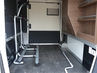 De camper heeft veel bergruimte in de ruime dubbele bodem bereikbaar dmv. verschillende luiken in de vloer en diverse kleppen buitenkant. Het bevat tevens een grote garage, met aan beide zijden een grote deur, waarin uw fietsen en bagage veilig binnen geplaatst kunnen worden.