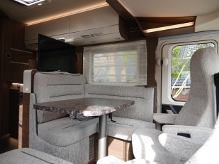 De comfortabele Aguti Ergoflex, zijn in hoogte verstelbaar en kantelbaar, draaibaar naar een gezellige comfort L-zit met luxe salontafel. Het interieur bestaat uit het moderne meubeldesign Velvet Ash met de luxe Korfu stofbekleding wat in combinatie met de vele (indirecte) LED verlichting een bijzondere sfeer geeft. Cabineramen zijn voorzien van vouw- verduistering van hoogwaardig plisséstof en bij het voorraam een elektrisch rolluik. De Dometic dakairco zorgt voor heerlijke koele temperaturen.