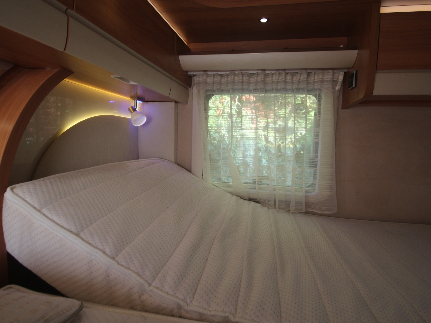 Het slaap gedeelte heeft achter 2 enkele bedden, dicht te leggen tot 1 groot bed, met het Hymer slaapcomfortsysteem met schotelsysteem en meer zone koudschuim matrassen. Hoofdeinden van de bedden zijn elektrisch in hoogte verstelbaar. Onder de bedden zijn 2 grote (hang) kasten voor kleding ed. Bovenin de cabine bevind zich een royaal 2 persoons hefbed, incl. het slaapcomfortsysteem.