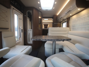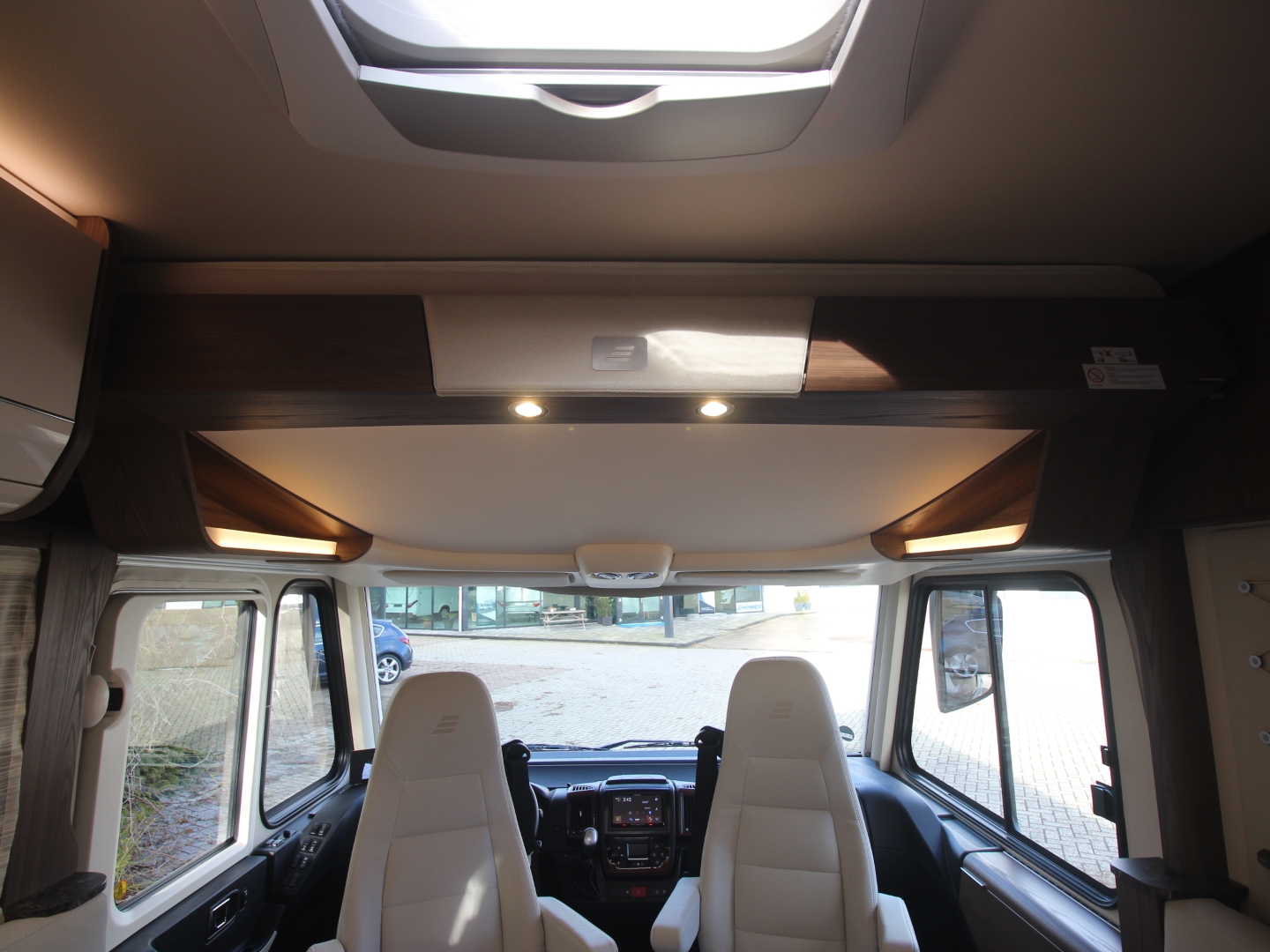 2 comfortabele Aguti Ergoflex pilotenstoelen in hoogte verstelbaar en kantelbaar, draaibaar naar een gezellige comfort L-zit met luxe salontafel. Het interieur bestaat uit het moderne meubeldesign Velvet Ash met de luxe ecotech bekleding wat in combinatie met de vele (indirecte) LED verlichting een bijzondere sfeer geeft. Cabineramen zijn voorzien van vouw- verduistering van hoogwaardig plisséstof en het voorraam word verduisterd door een elektrisch rolluik.