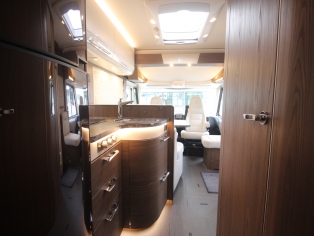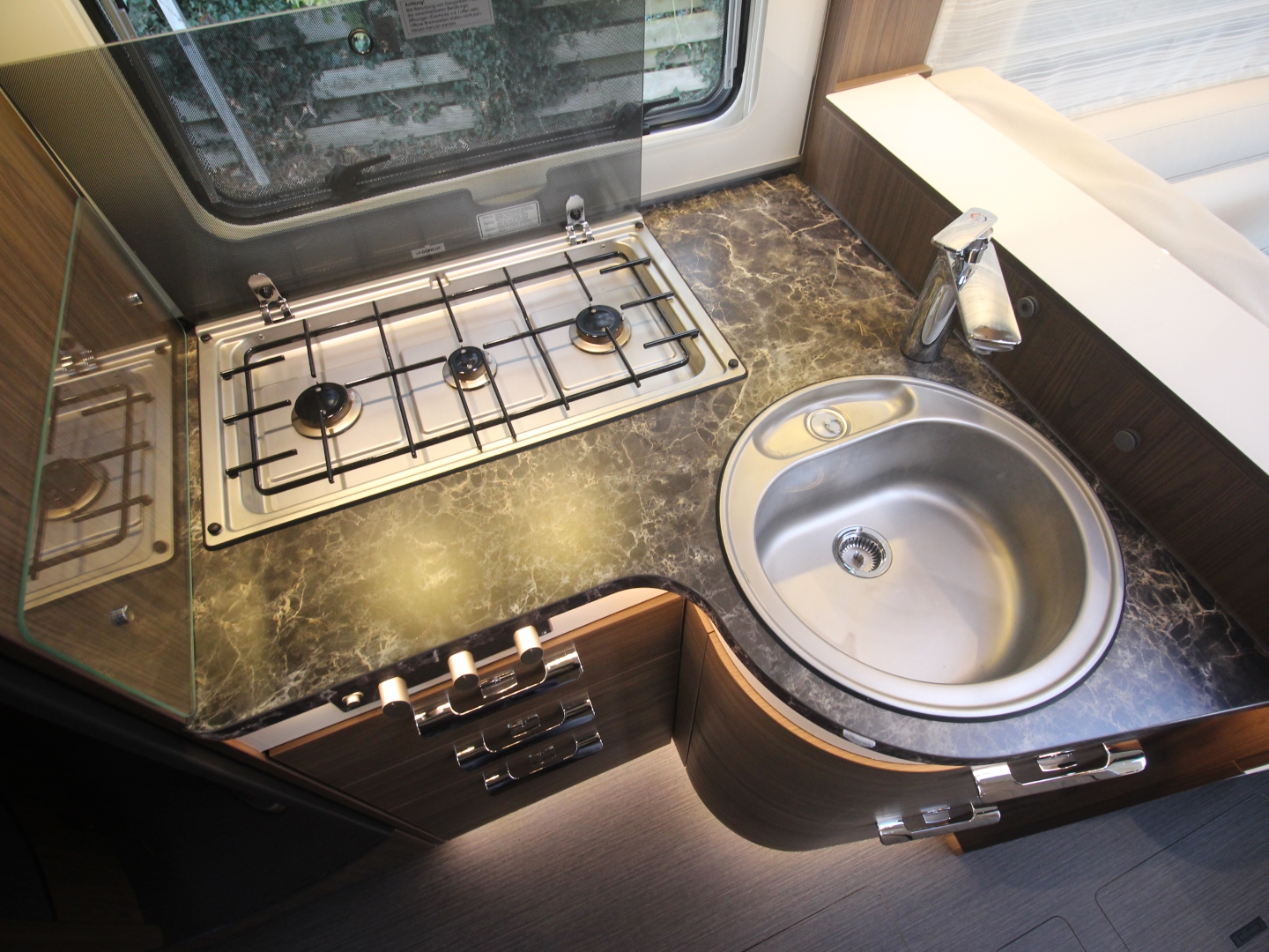 De royale keuken heeft een luxe keukenblad met spoelbak en 3 pits kooktoestel met automatische ontsteking, diverse gelagerde laden met verrassend veel bergruimte voor het kookgerei en boodschappen, grote dubbeldeurs koelkast 160 ltr met aparte vriezer, oven en automatische omschakeling van 220 V/12 V/gas