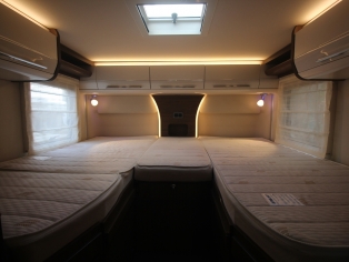 Het slaap gedeelte heeft achter 2 enkele bedden, dicht te leggen tot 1 groot bed, met het Hymer slaapcomfort systeem. Bovenin de cabine bevind zich een royaal 2 persoons hefbed.