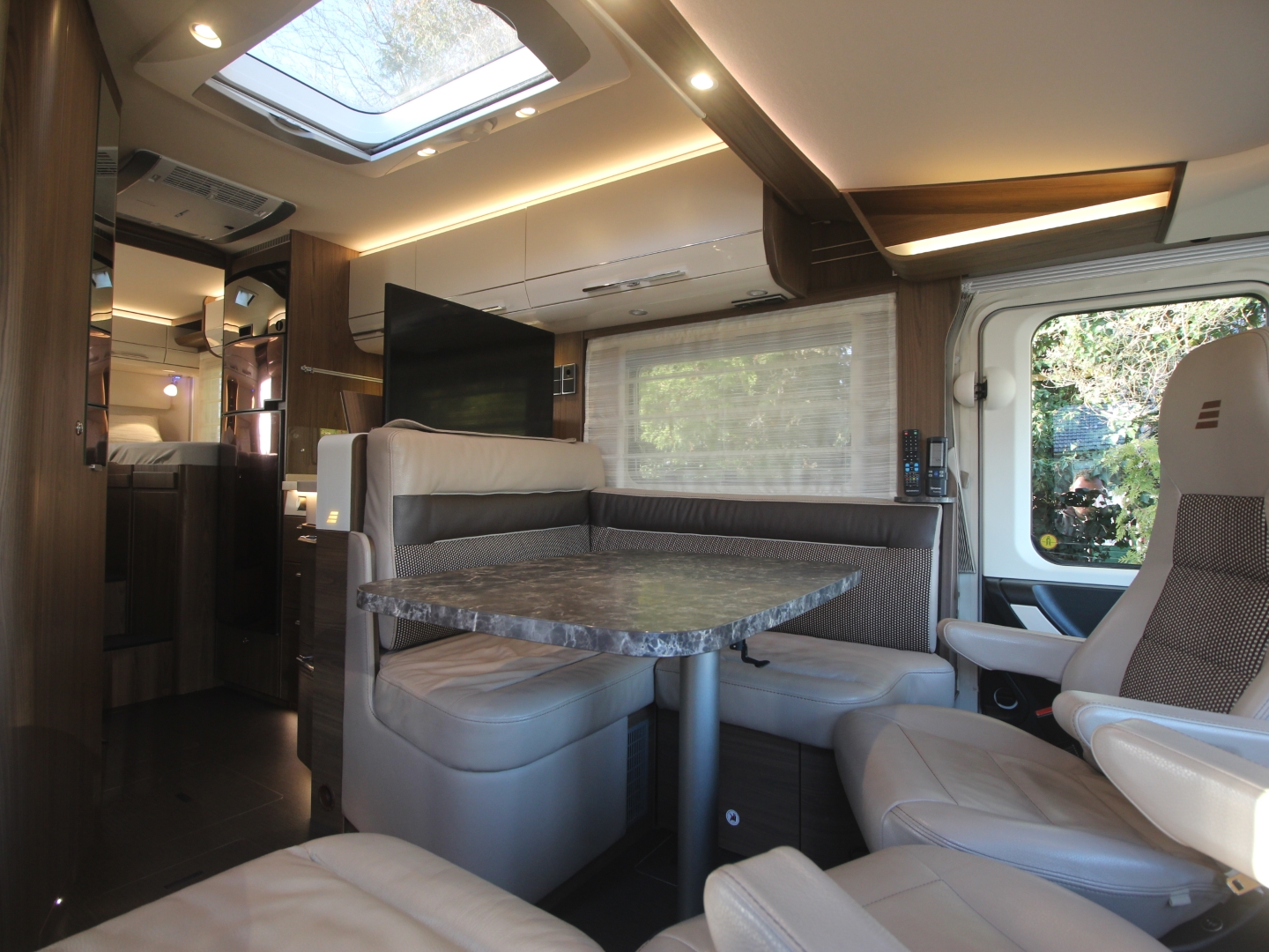 2 comfortabele met leer beklede Aguti Ergoflex pilotenstoelen in hoogte verstelbaar en kantelbaar, draaibaar naar een gezellige comfort L-zit met luxe salontafel. Het interieur bestaat uit het moderne meubeldesign Velvet Ash met de luxe Tabago leer/stof bekleding wat in combinatie met de vele (indirecte) LED verlichting een bijzondere sfeer geeft. Cabineramen zijn voorzien van vouw- verduistering van hoogwaardig plisséstof en het voorraam word verduisterd door een elektrisch rolluik. Het interieur is heerlijk koel te houden met de Truma Aventa dakairco.