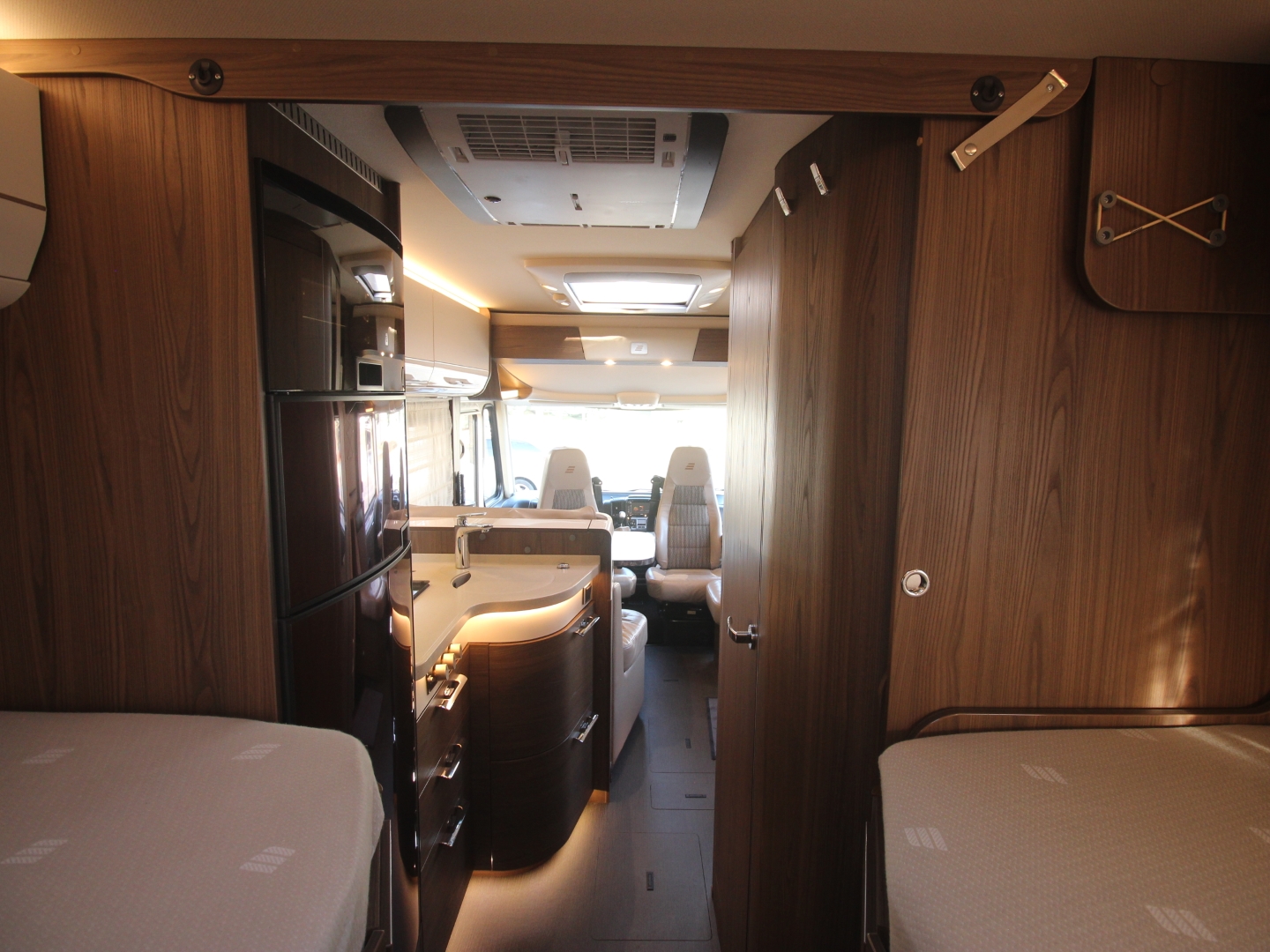 Het slaap gedeelte heeft achter 2 enkele bedden, dicht te leggen tot 1 groot bed, met het Hymer slaapcomfort schotelsysteem. Bovenin de cabine bevind zich een royaal 2 persoons hefbed.